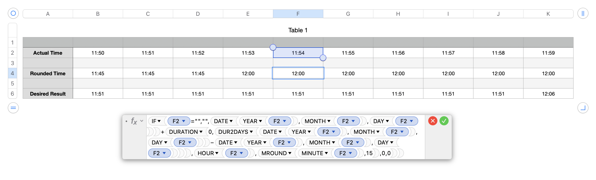 Rounding finish time with 6-minute offset in Numbers spreadsheet