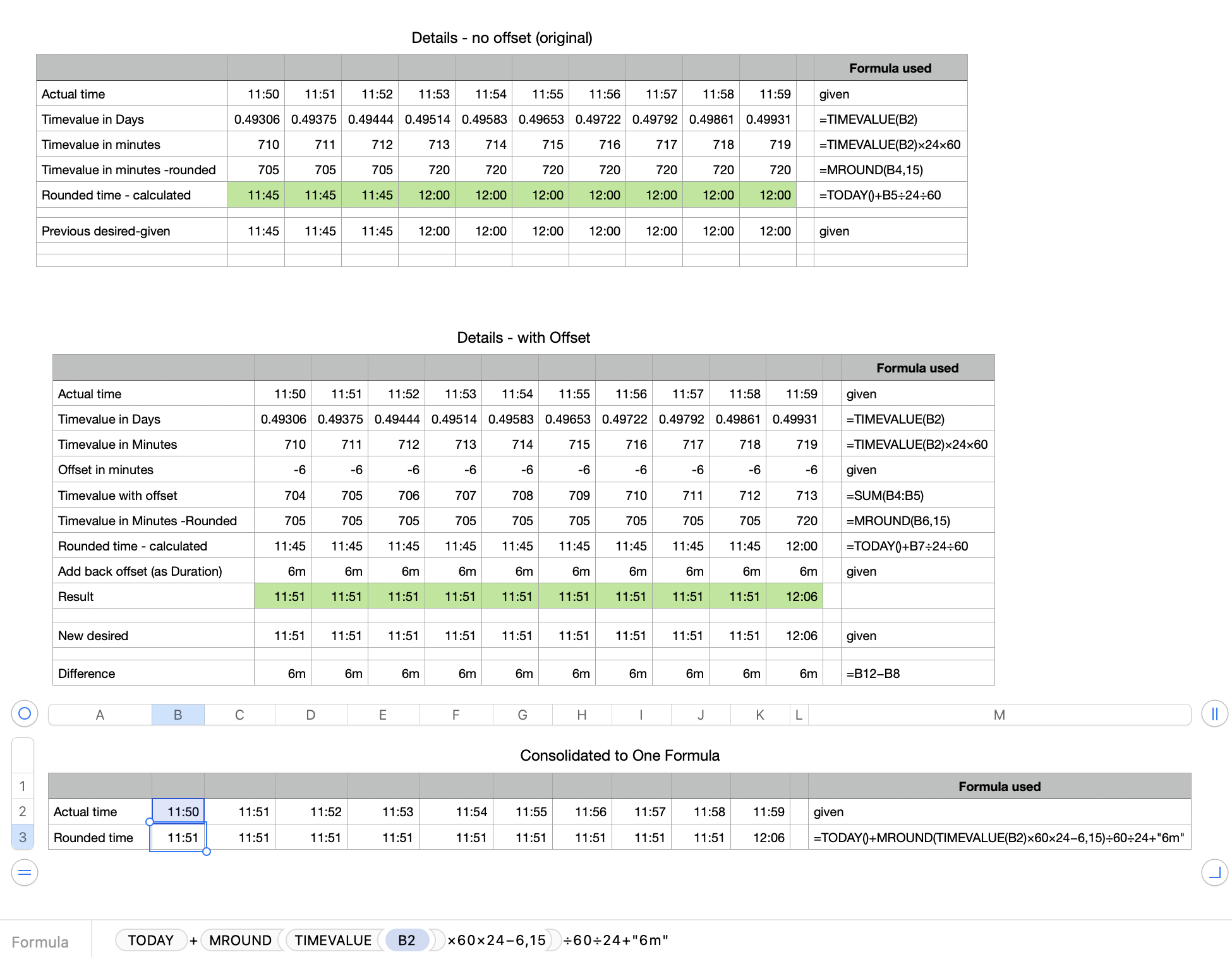 My finish time is always rounded to the nearest 15 minute mark and I use a formula to give the desired rounded time. Until recently, that has been quite simple as the times were rounded in equal 15 minute intervals (00, 15, 30 & 45). However, a recent overhaul of the business has seen many changes, including our number of rostered hours, which affects the finish times. Our finish times are still rounded to 15 minute intervals, but they are no longer at the usual 15 minute marks – there is a 6 minute offset (06, 21, 36 & 51).