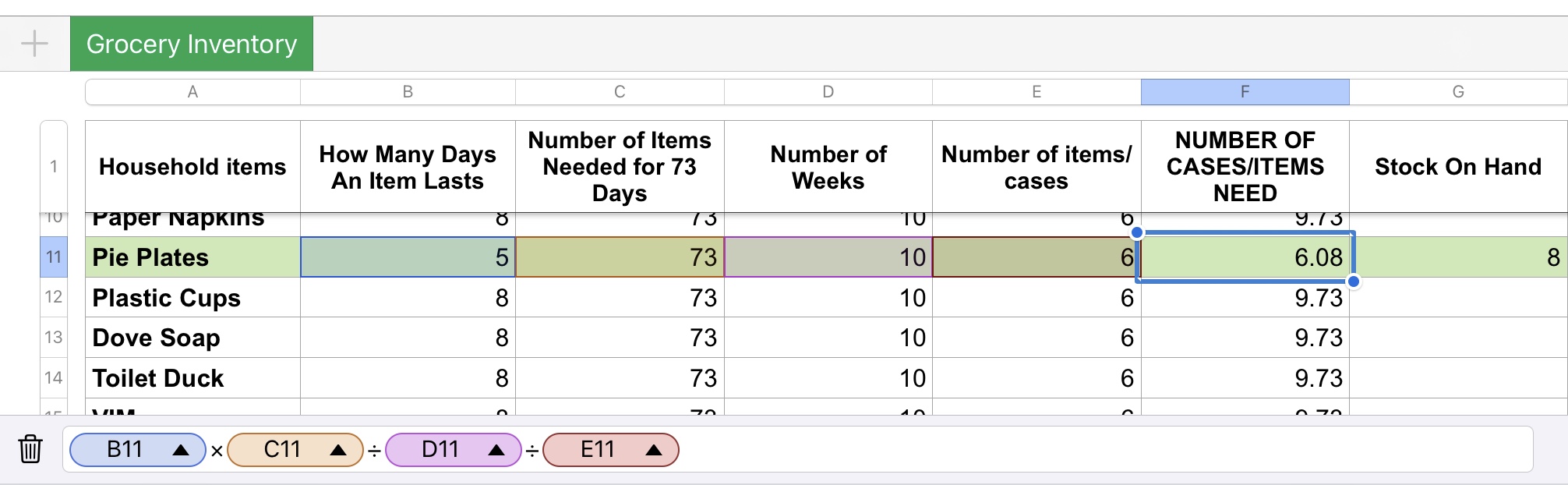 For example, at face value, you say that 'an item' of pie plates lasts 5 days, and that you need 73 'items' for the 73-day period. Extrapolating that out, if a case of pie places contains 6 plates, then you need 73 / 6 cases, no? That equates to just over 12 cases.