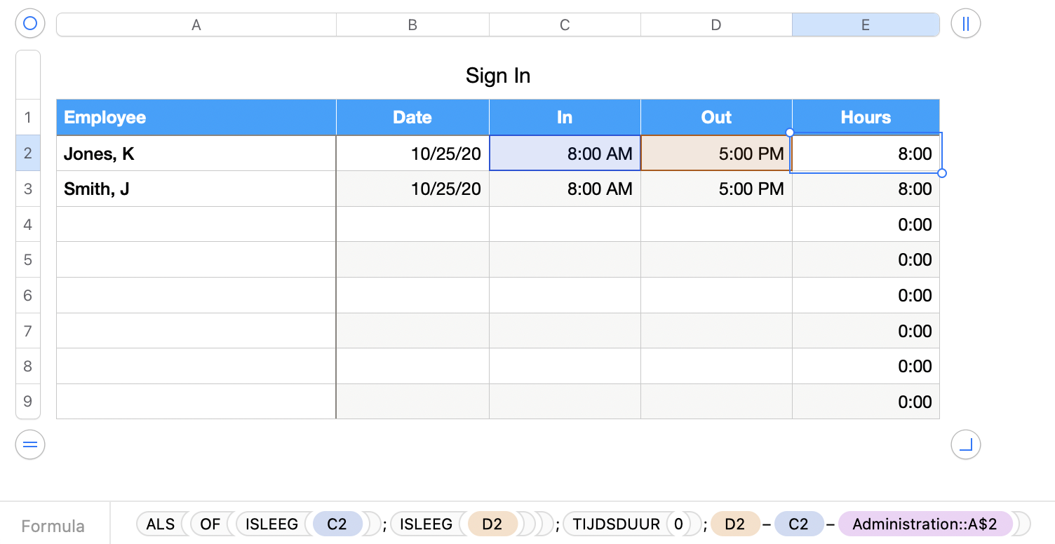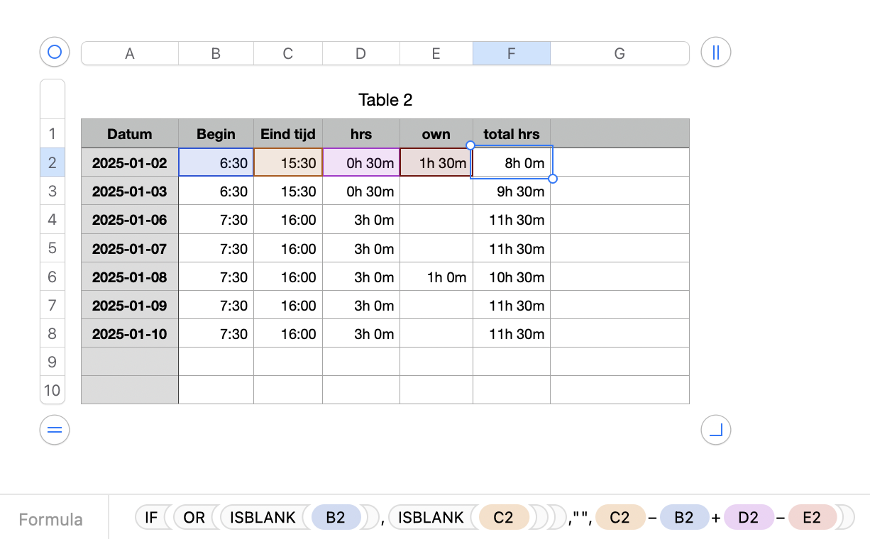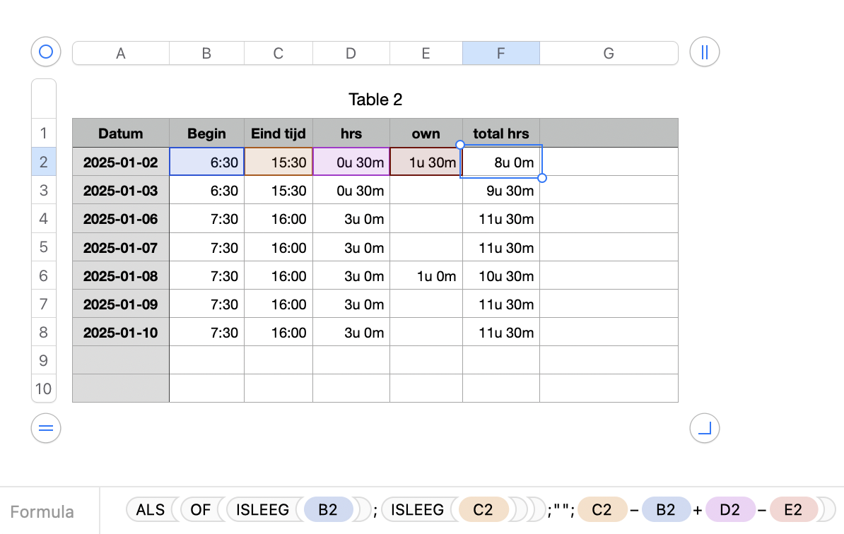 =ALS(OF(ISLEEG(B2);ISLEEG(C2));"";MAX(C2−B2+D2−E2;"0m"))
