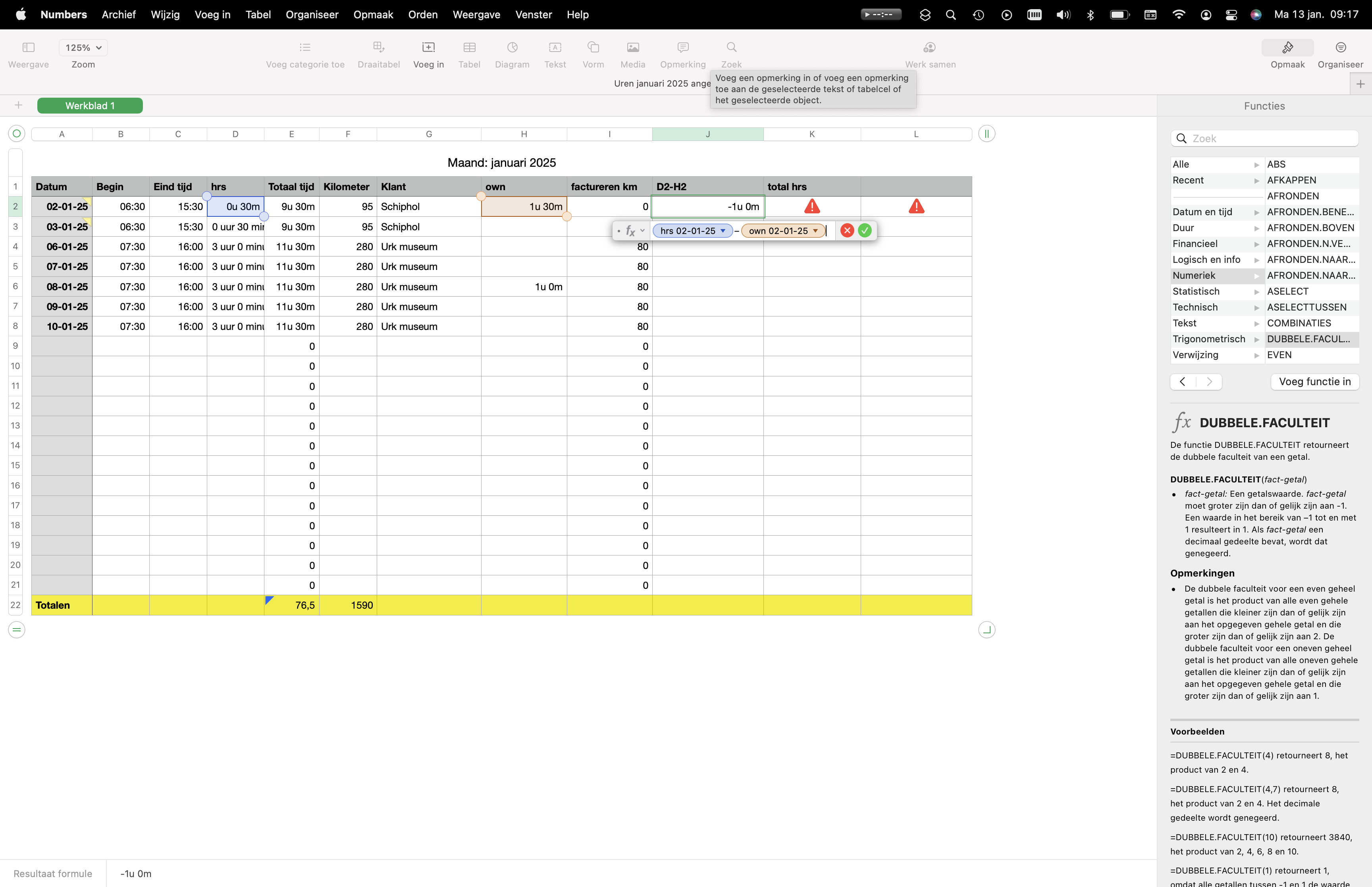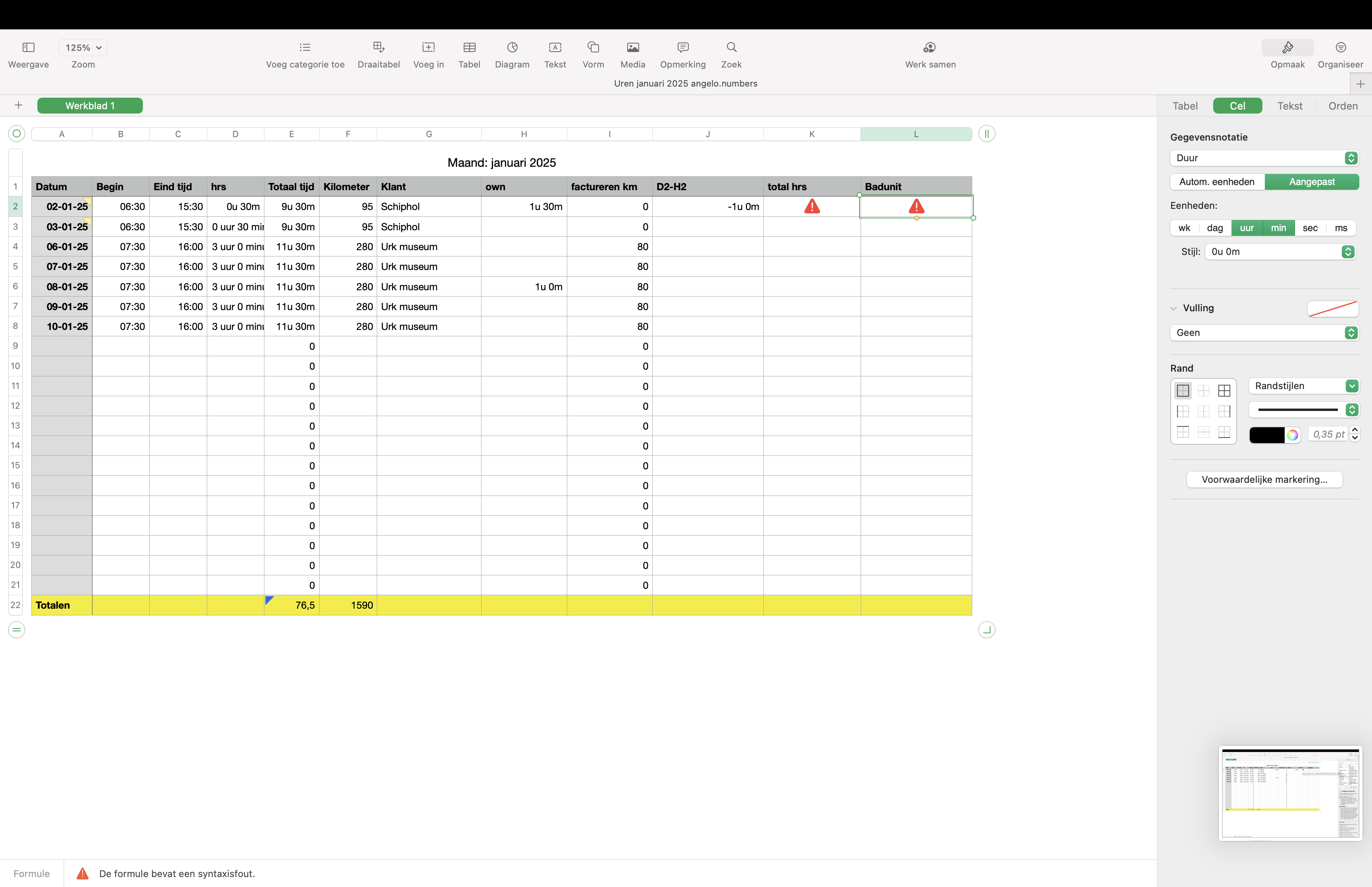 I believe the issue is in column D. Did you enter the value the same way you did in column H? The former shows the word/abbreviation "uur" while the latter shows "u".