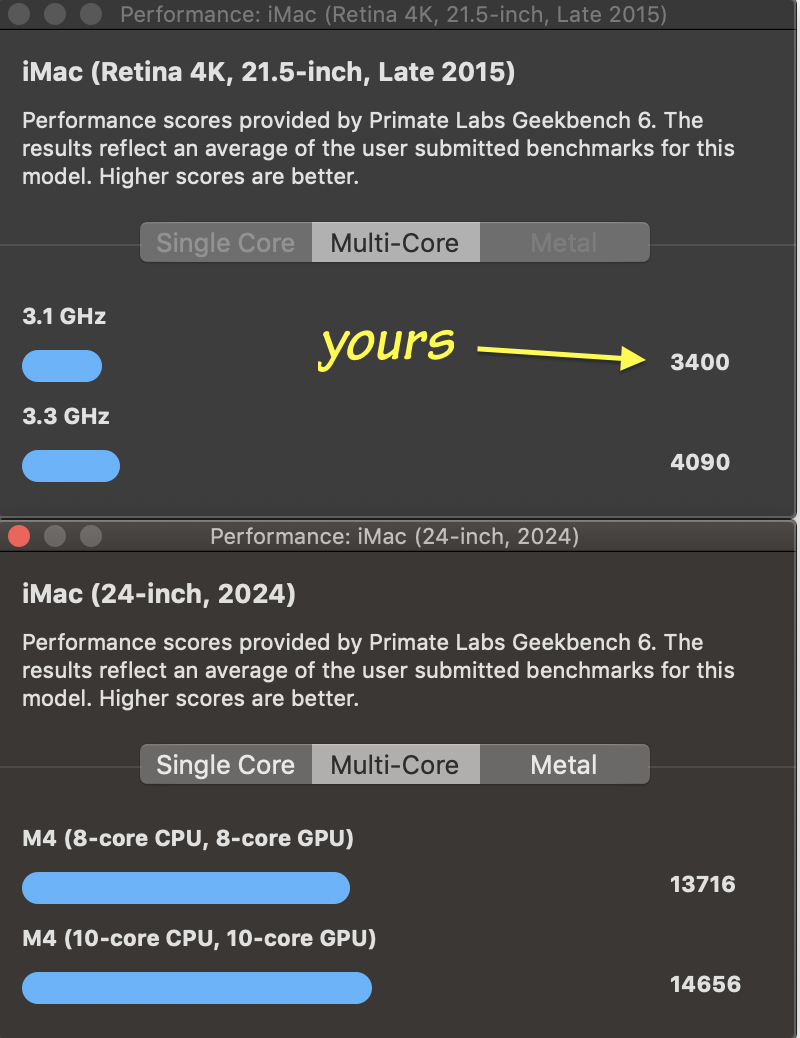 The MacTracker database (free in the Mac App Store) has benchmark test results for many Mac models. This is your 2015 model compared to the current M4 iMac: