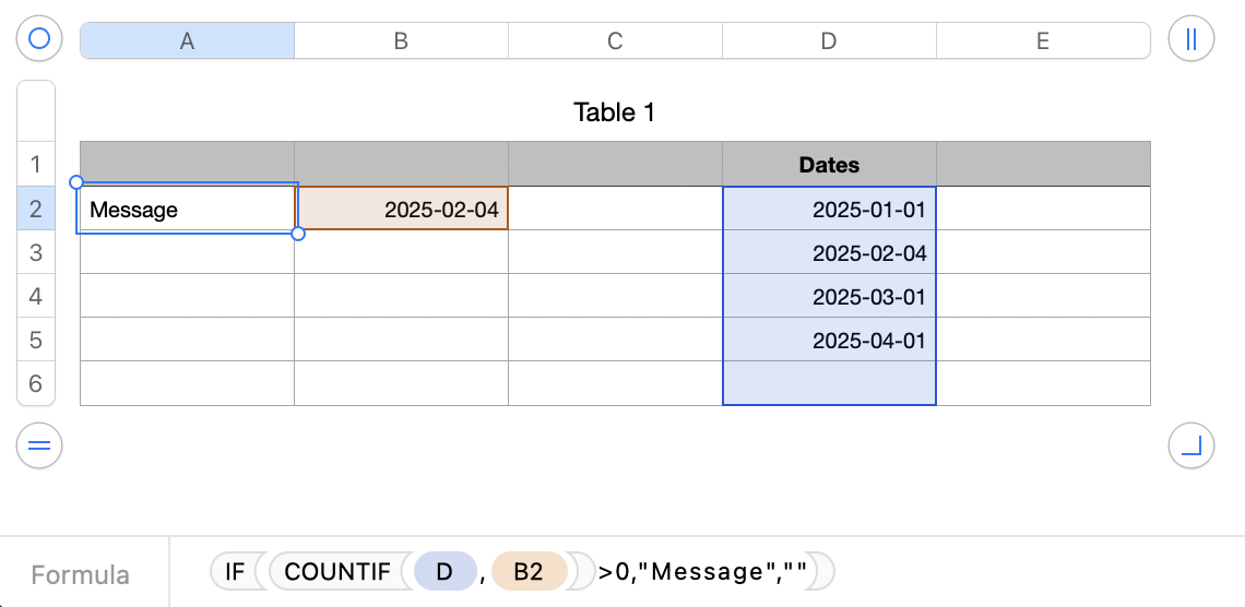 =IF(COUNTIF(D,B2)>0,"Message","")