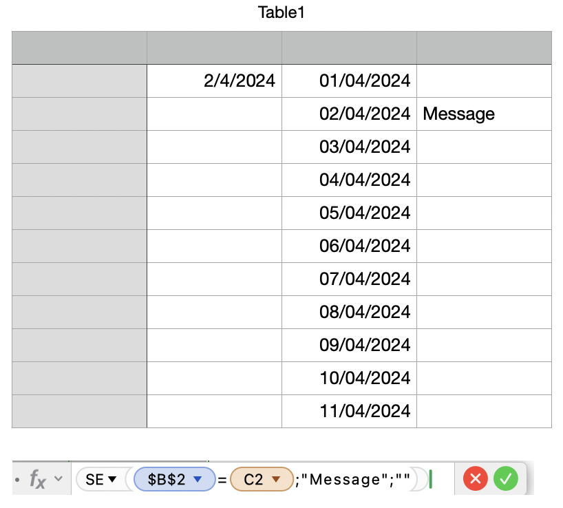 Is equal to, select column C, return Message
