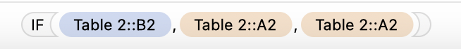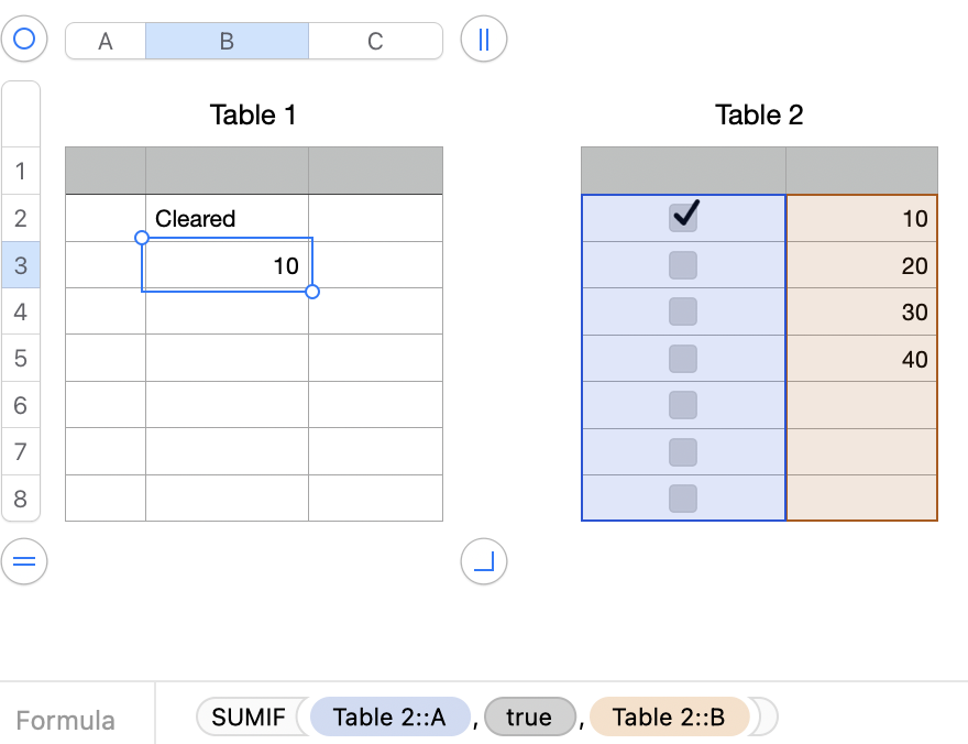 =SUMIF(Table 2::A,TRUE,Table 2::B)