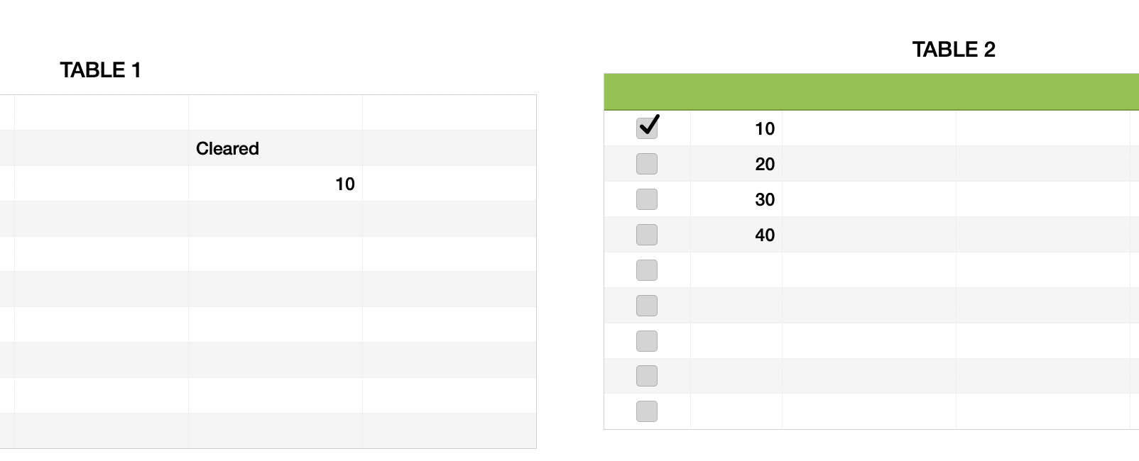 I have a table with cleared column, what I'm trying to do is If I checked the checkbox I want that amount to be added on the other table, for context this is what I'm trying to do.