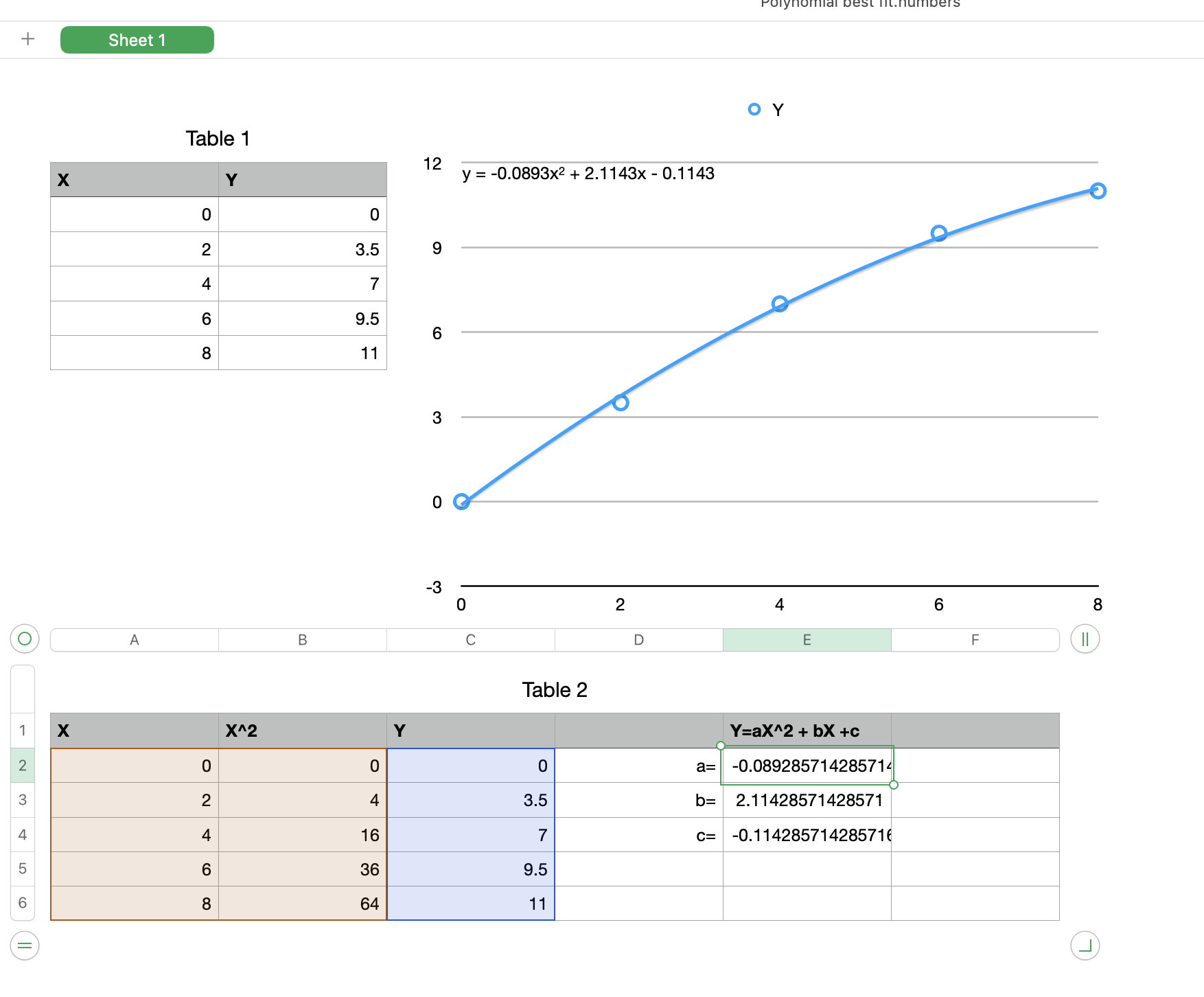 I have a dataset of number pairs that do define a quite smooth curve with some gentle curves. Plotted in Numbers, by eye the polynomial trendline appears to be a good fit if it is 5th order. But the displayed equation does not seem to display enough accuracy (digits) to allow me to use them to calculate good values. For example the 5th order coefficient is displayed as "-0.0004", which could be anywhere from -0.000351 to -0.000449. What the actual value of that coefficient is makes a big difference in the outcome, as x values go as high as 365. I have tried using more digits to optimize each coefficient separately, but that's what a least squares fitting code should be doing properly for all of the coefficients simultaneously for me. How can I get more accuracy (digits) in the displayed values of the coefficients of the fitted polynomial?
