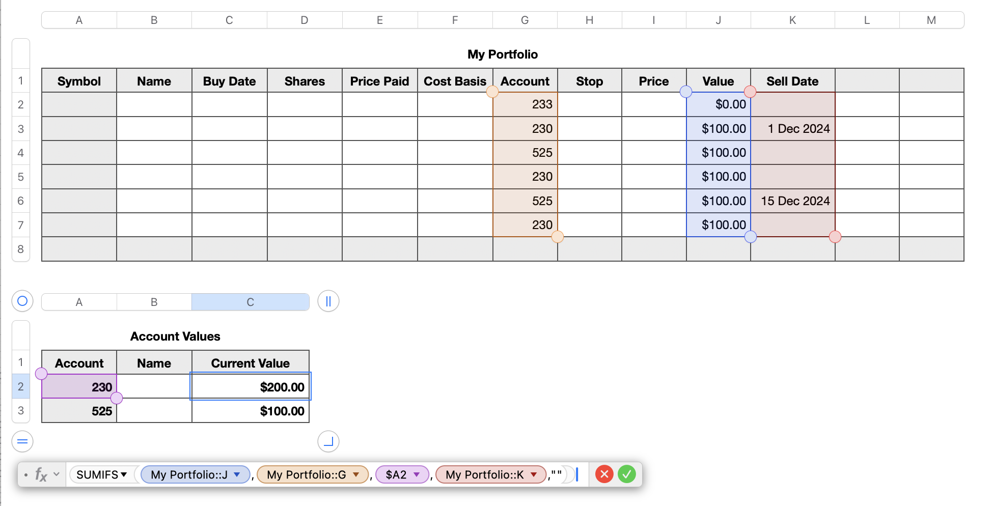 SUMIFS(My Portfolio::Value,My Portfolio::Account,230,My Portfolio::Sell Date,,)