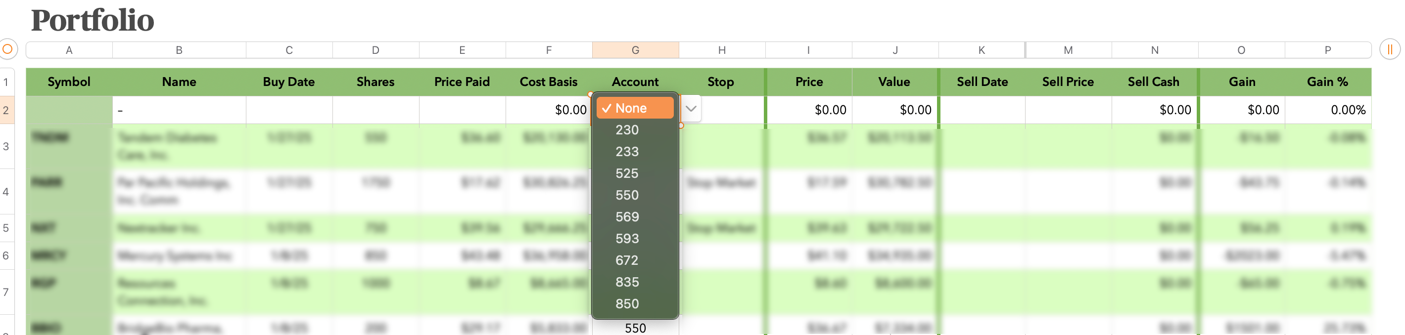 I have a Numbers spreadsheet that I use to track my stock trading. I have multiple accounts. My main table ("My Portfolio" in the Portfolio screenshot below) shows the usual trading info: