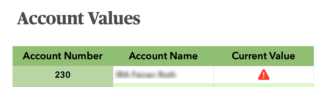 Since my accounts are listed only as "numbers" and selected from a popup menu, I have a second smaller table (Account Values below) that ties the account numbers to a more readable account name and I'm now adding a column to sum up the current market value of the stocks in each account. I plan to cross-reference these calculated values to my broker accounts to verify there are no errors. Populating the "Current Value" field is where I'm stuck.
