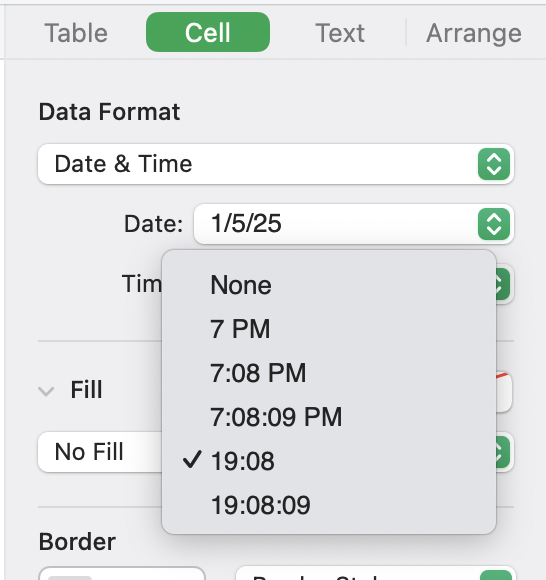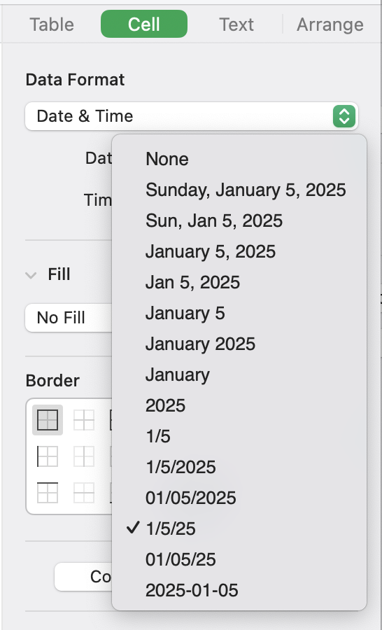If you have a cell set to a Date, right off the bat Numbers gives you fifteen ways to format the date, and 6 ways to format the time, for 90 different ways.