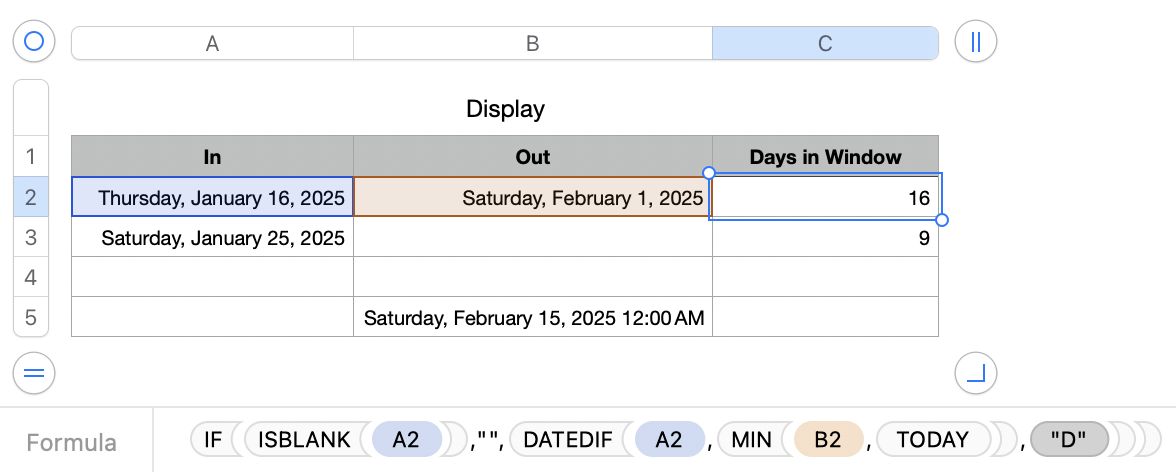 Trying to get a formula to go into Column C. For row 2, I'd like the number of days between A2 and B2, but in row 3, the number of days between A3 and today's current date. If I could have one formula so I can drag it down the entire column, it would be great. Thank you!