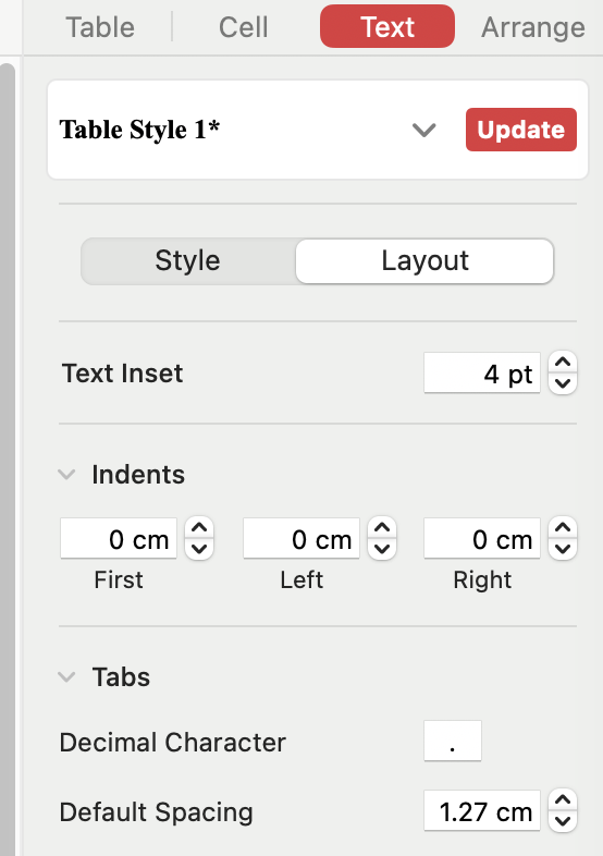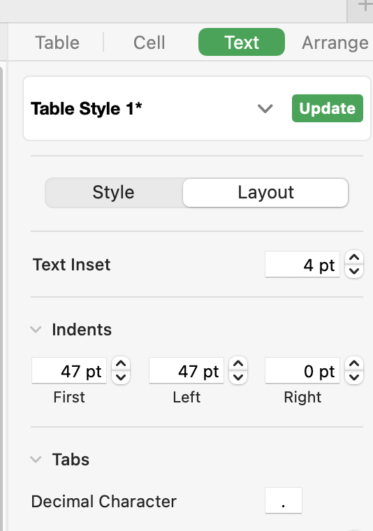 While working on a spreadsheet with a cell selected, I accidentally hit the Update in Text/Table Style 1 (I have a trackpad). I only know because there was an Update box and now it's no longer there. ALL the cell contents have shifted to the right within the cell (both numbers and text). However, there is a huge space on the left which just cannot be used. The spreadsheet has 7 tabs and in ALL of them this has occurred too.