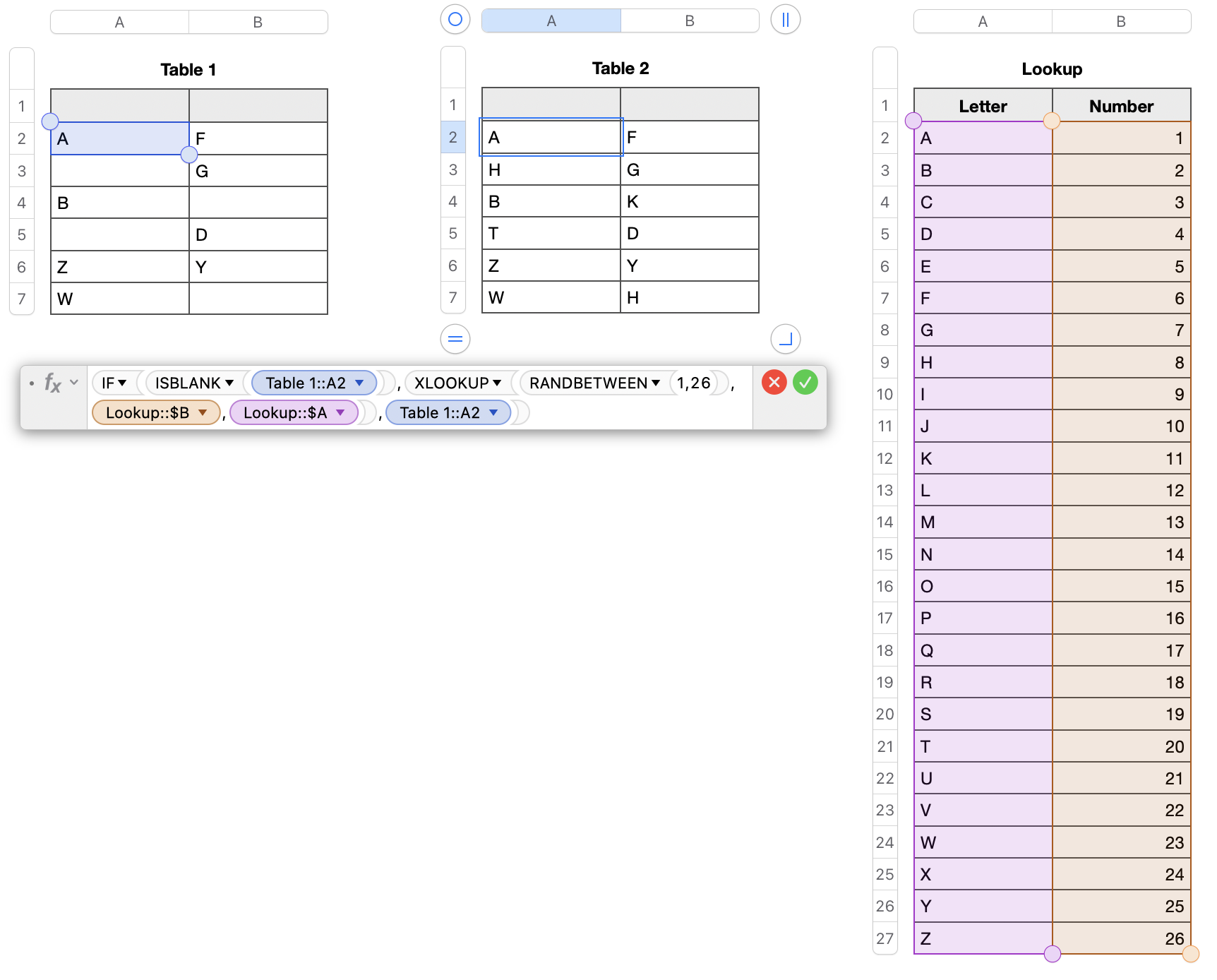 Table 2 will "pull" values from either the Lookup table (with RANDBETWEEN) if a cell in Table 1 is blank, or will "pull" the existing letter from Table 1 if it is not blank.