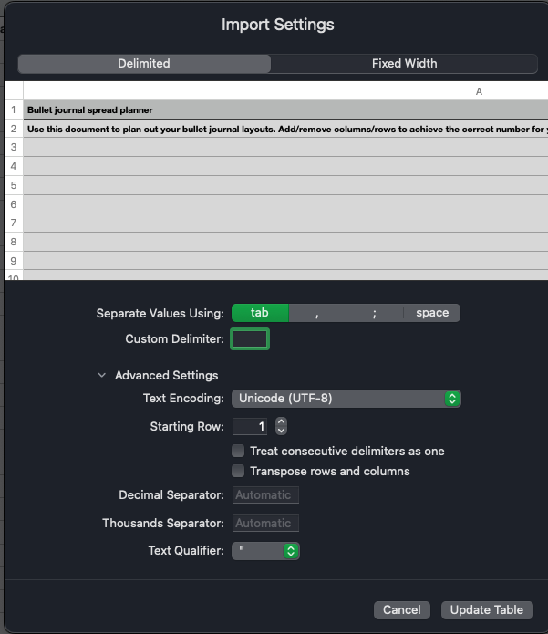 When I try to open after having saved (exported) it using the (.tsv) extension I get this image below but I'm not sure how to navigate or fill in the information so that it will look the way it does in the original