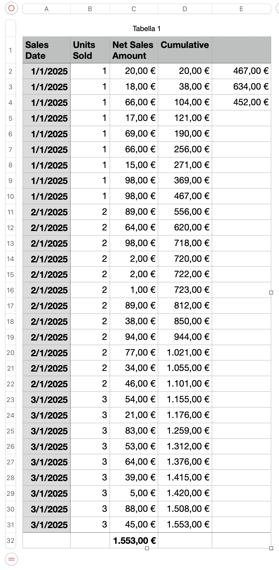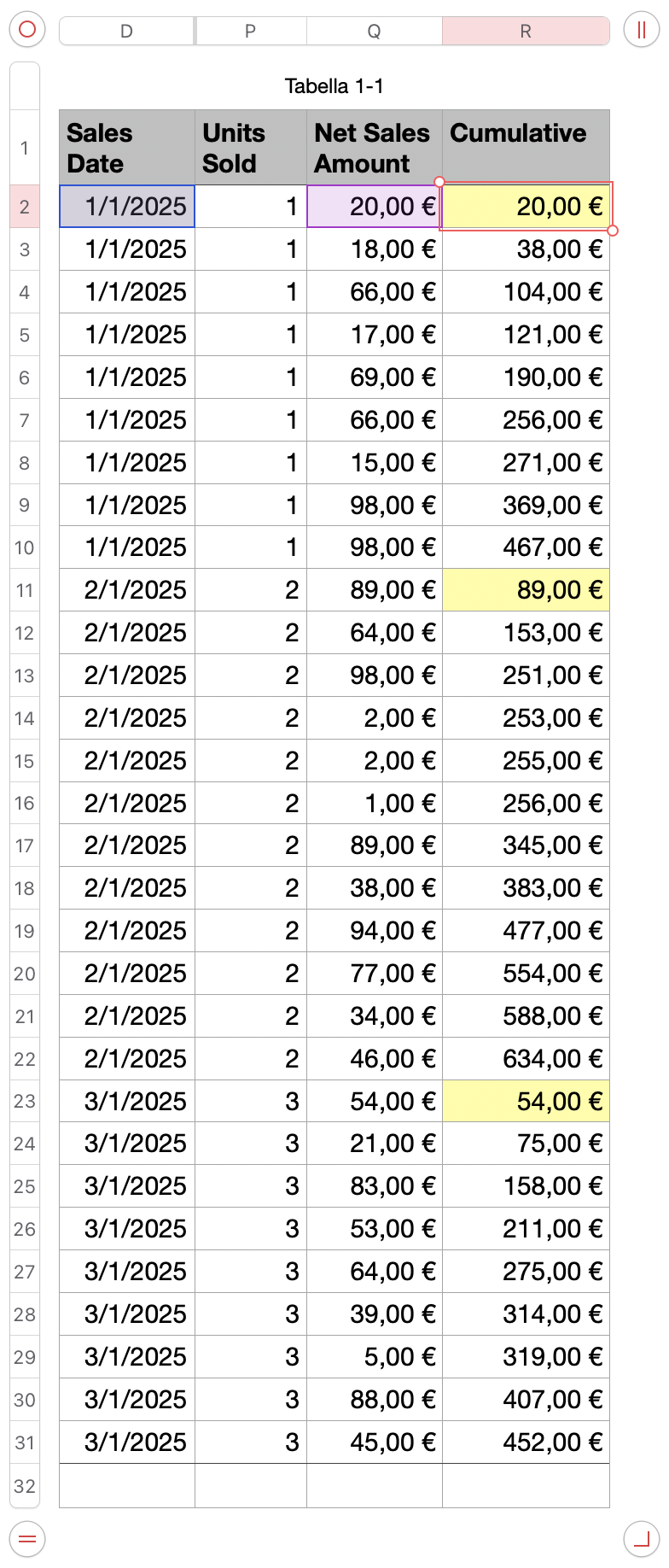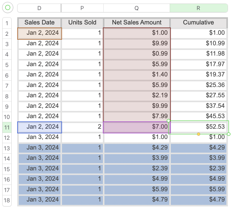 - If a date is out of place (like there is a 1/3/24 in the middle of the 1/2/24's): The formula will give you a cumulative number for this row that will be part of the cumulative for its date. It will just be out of place in your table.