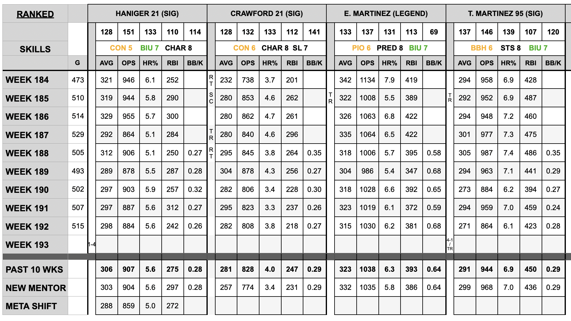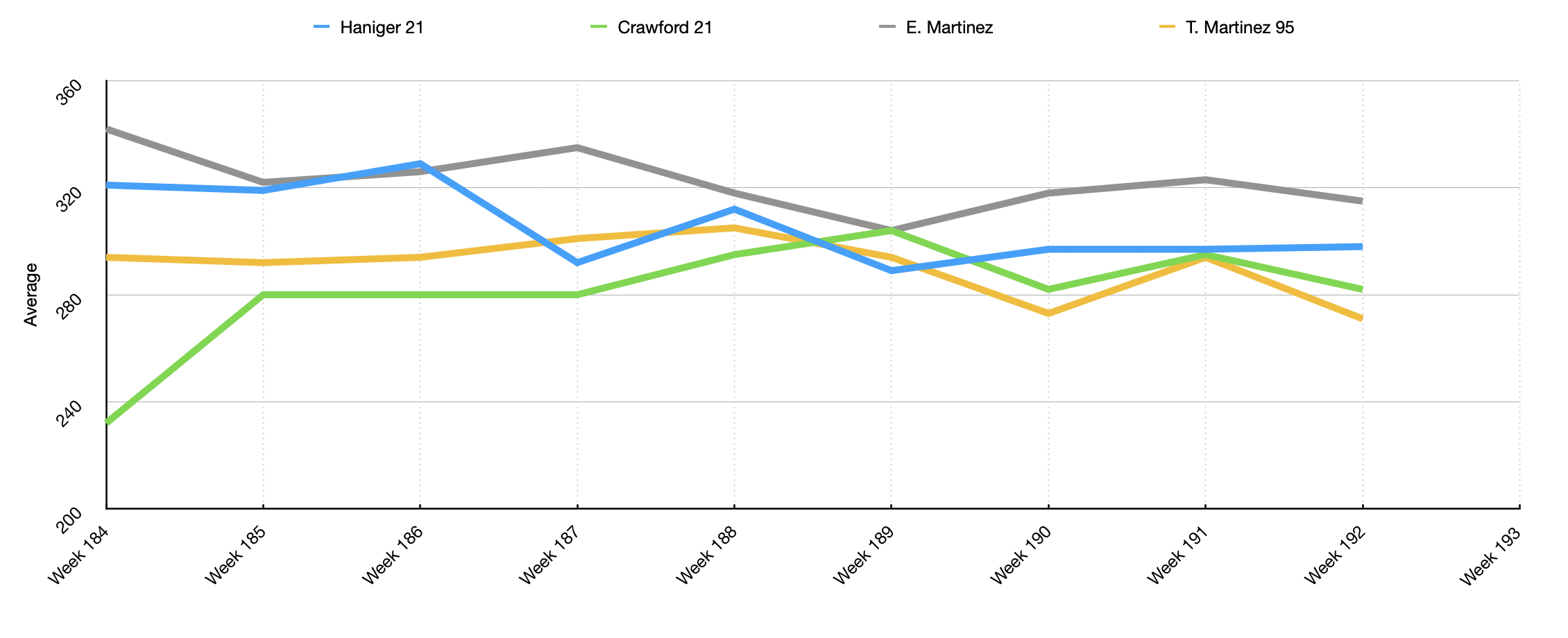 I have a baseball game data sheet I'd like to create a graph for but can't figure out how to create a graph to represent what I want to compare. I want to compare each stat for each batter. For example compare the avg for each batter. I'd also like to track all stats for each batter separately. If I select the individual data for each batter, ie avg it doesn't give me a line for each batter for that stat, if that makes sense.