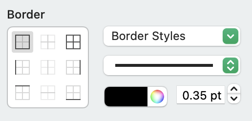 If you want to change the border of specific cells, you can do that by going to the Format tool in the top right > Cell > Border, then changing the style. You can specify which edges of the cells you want, border style (solid, dashed, or dotted), change the color, and change the width. Some border options only apply if you have mutliple cells selected.