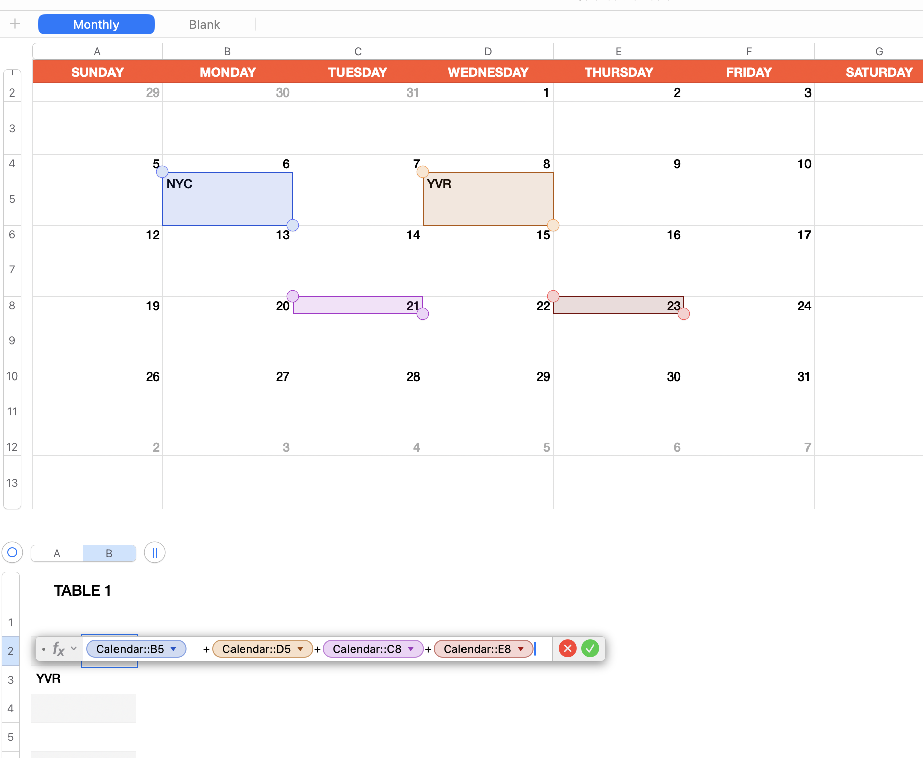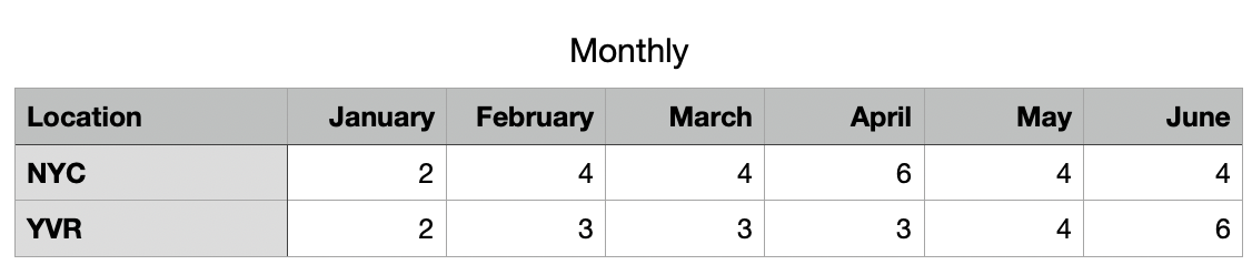 So that you know, and for clarity, I am using this new table to count days in either location, NYC and YVR, only. My concept is to create a calendar that shows how many days were spent in NYC and YVR each month, (each month containing two cells that show that total) and two more cells that show a running total (cumulative) of the number of days spent in NYC and YVR for the year. those two cells will appear once at either the beginning or the end of the year.