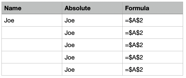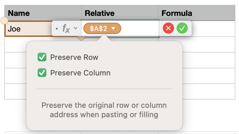 You can choose either row or column, or both, depending on what you want. In this case, I ALWAYS want to reference cell A2, so I preserve both: