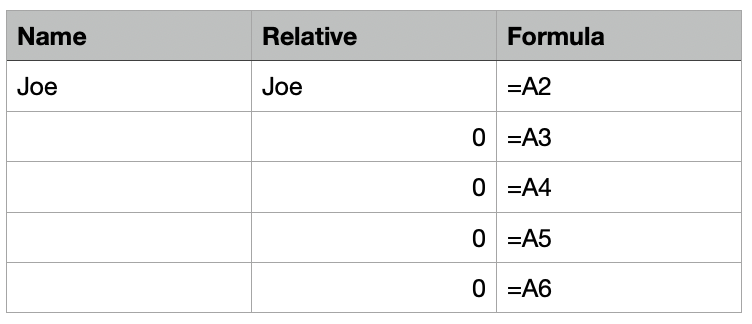 Now you can see the cell B3 is referencing A3 (relative: one column to the left), and that's empty. Likewise for the rest of the column.