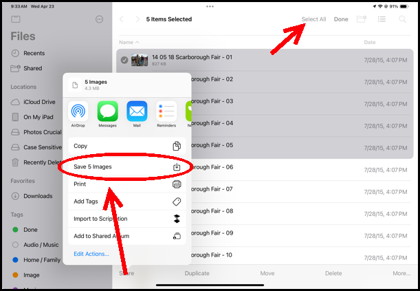 When I tap on a Folder I might see other folders, and I navigate to some picture files, just like any directory. I can tap on the "Select" button at upper right, and slide my finger over the check circles. Then I tap on the Share button on the bottom to bring up the Share menu with the choice "Save Files."