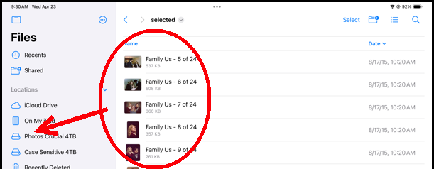 If I plug in an SD card and reader, or a hard drive into the C port on my iPad and go to the Files app (makes sense, no?) I can open the iPad files, my iCloud Drive files, or my "Crucial" files. Tapping the latter, I see the directory of my drive.