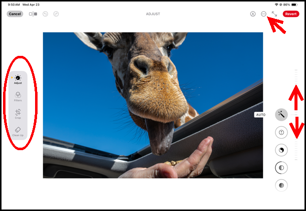 Just like on a Mac, you get Adjust, Filters, Crop, and Clean Up (from Apple Intelligence.) The actual adjustments have vertical sliders on the right. And don't' forget the (•••) More button up top.