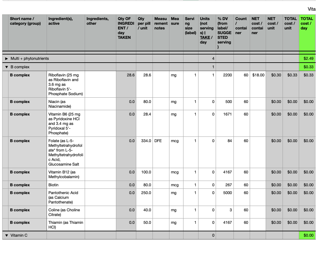 B complex [category] Total [currency format] Sum (summary) of "TOTAL cost / day" e.g., $0.33