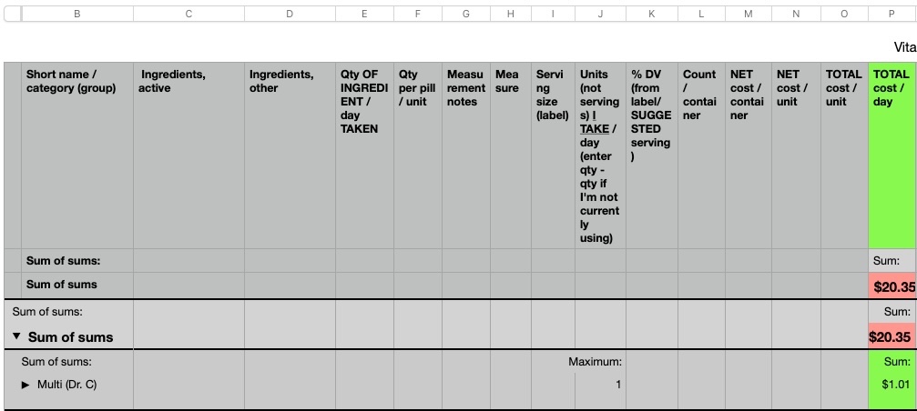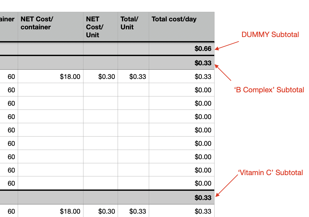 (Note: I sometimes have more than row per category with different ingredients in a given supplement, but only list "Cost" in the first row to track the daily cost of the supplement. The reason for multiple rows is to track daily amounts taken of each supplement's ingredients, but I'm not trying to somehow track the cost of each ingredient.)