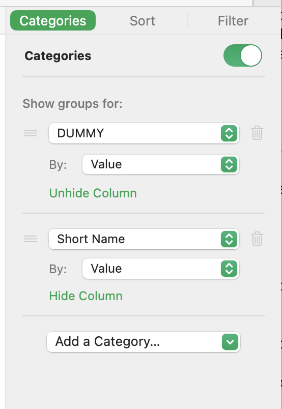 From Numbers help: "A table can have one main category and up to four subcategories to create a hierarchy for your data. You can change this hierarchy, rename or delete categories, and more."