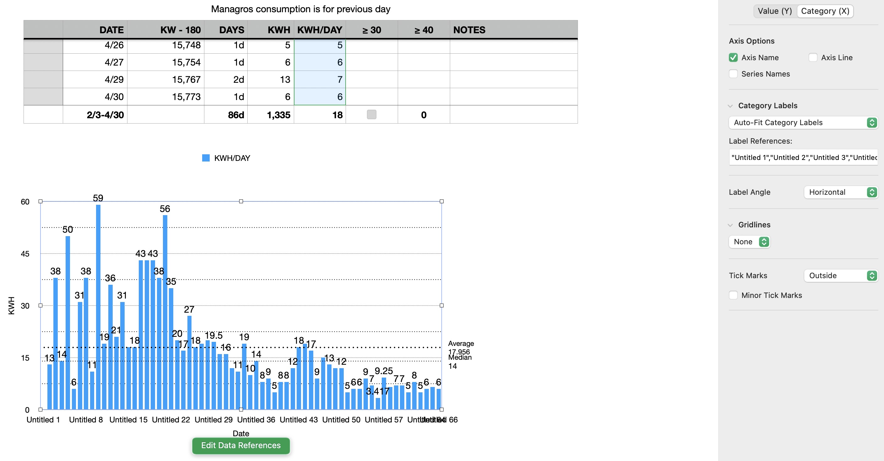 I enter almost every day into a spreadsheet the reading of my electricity meter to calculate how many kwh I consume every day throughout the year. I have completed February, March, April so far. And I have a chart to show the progress. So far so good except...I can't get it to show dates or months. It shows untitled 1, 2, 3 where the dates should be