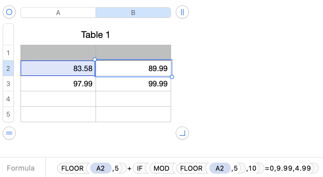 The idea for this is if I have a cost of $83.58, I would like it rounded up to $84.99. If I have $97.99 I would like that rounded to $99.99. I would like it rounded to the nearest 4.99 or 9.99.