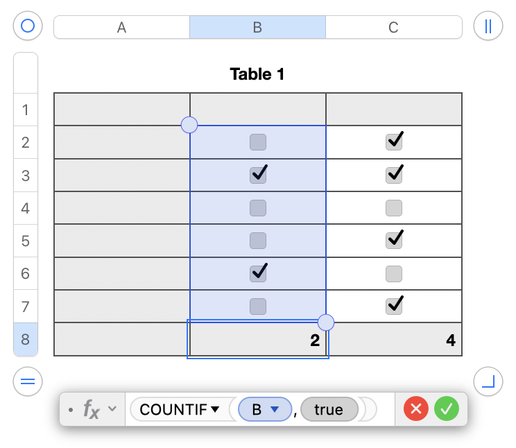 Formula in Footer Cell B8 is COUNTIF(B,TRUE)