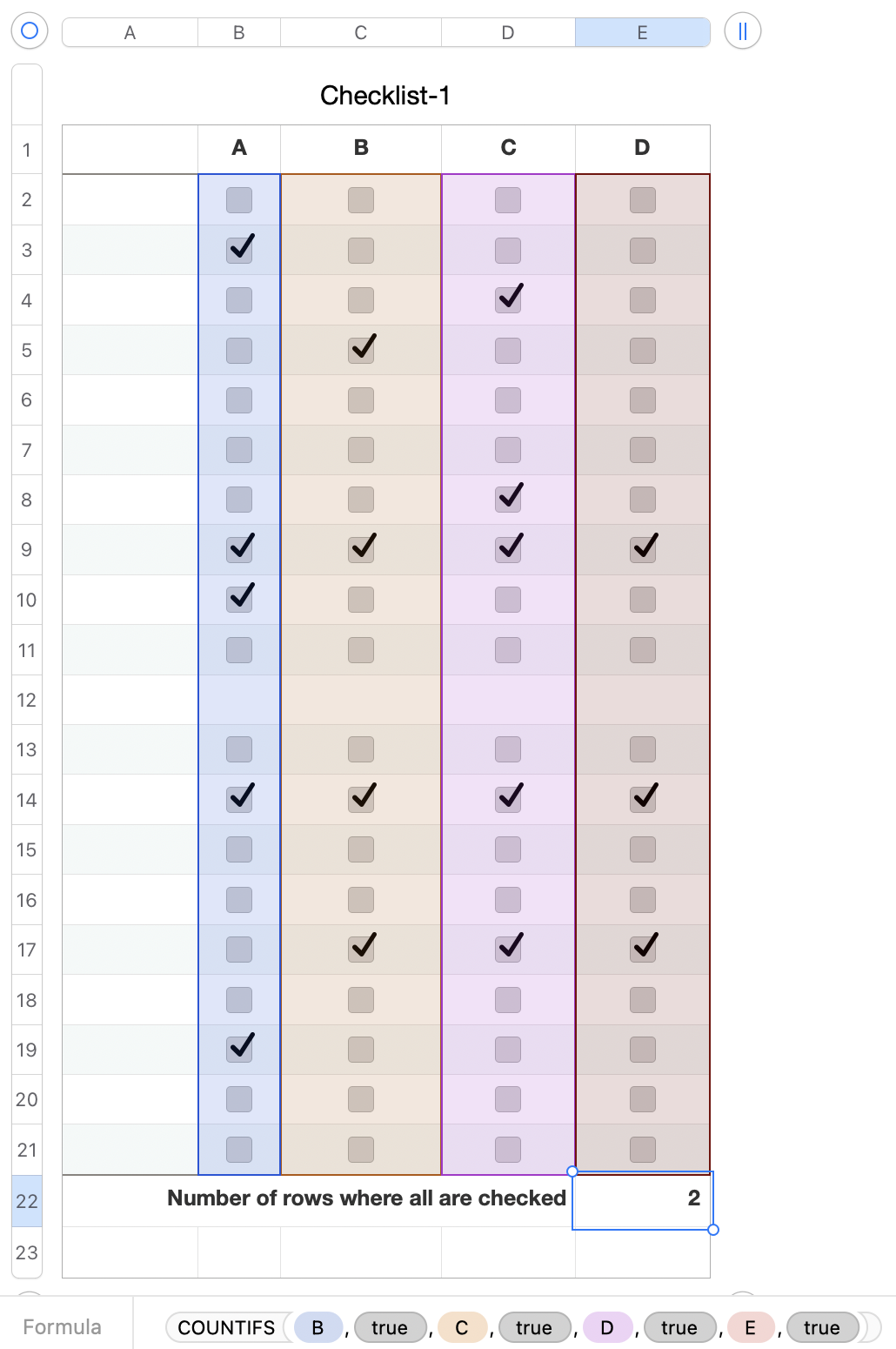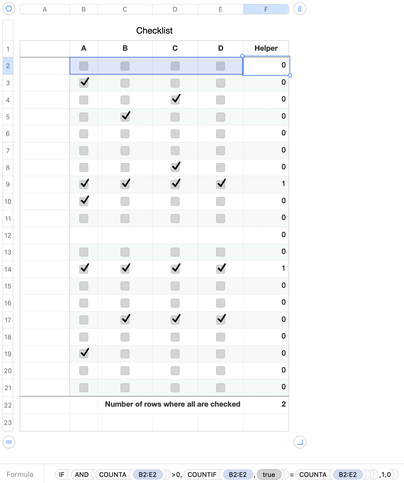 Assuming you mean count rows which have all checkboxes checked here is another approach that doesn't need a helper column.