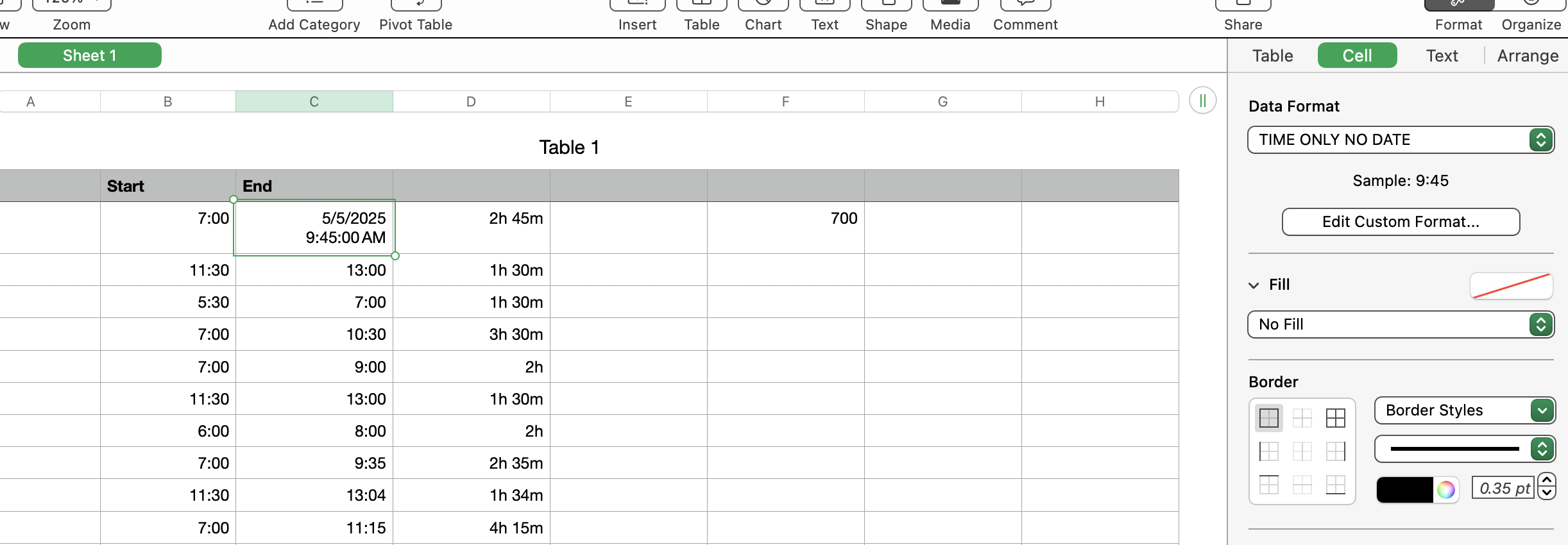 I am building a spreadsheet with two columns of hours and minutes in each column so I can subtract the two to get the hours and minutes worked. I have made a custom format with hours in minutes and save it. When I go back to add a time ie. 7:08 it puts it in the field as 5/5/2025 7:08:00 am. I dont want the date since this will effect the calculations if I dont enter every number new each week. - If Someone starts at 7:00 today and works till 3:00 and the next week I have the same person start at 7:00 and work until 3:05 it will show 7 days and 8 hours because the date will be a week apart(the 7:00 start from the week before and the 3:05 from today.