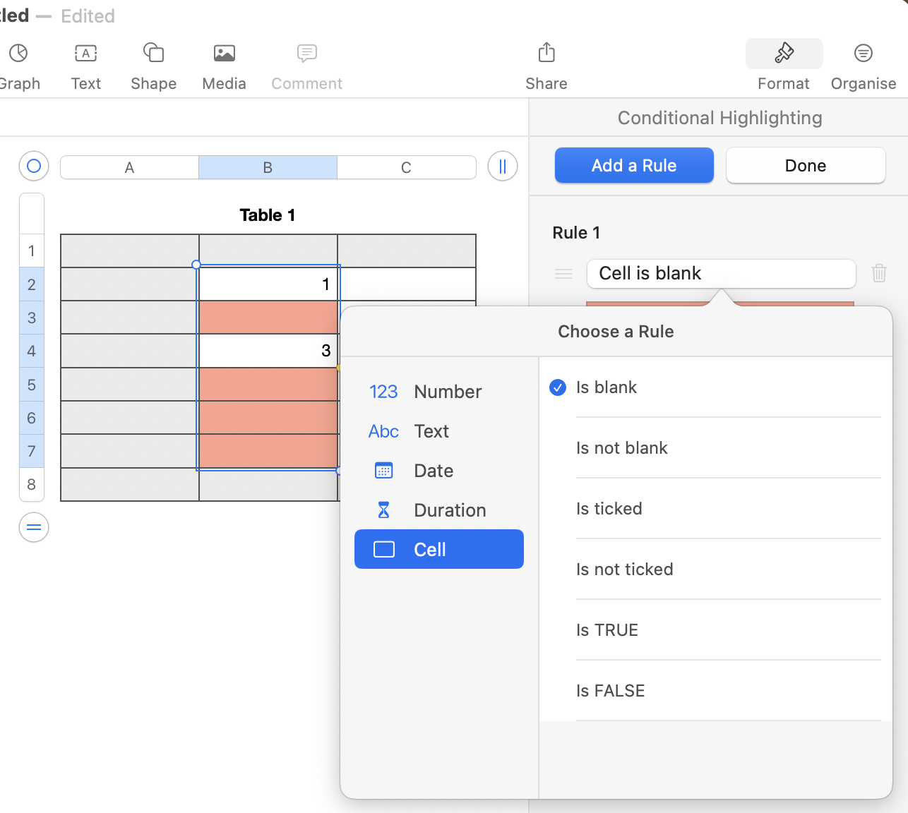 How can I use custom format to show N/A in empty cells in Numbers?
