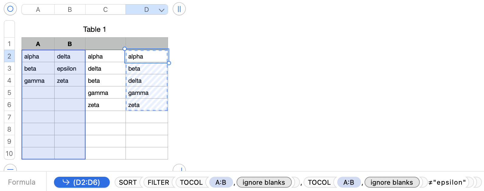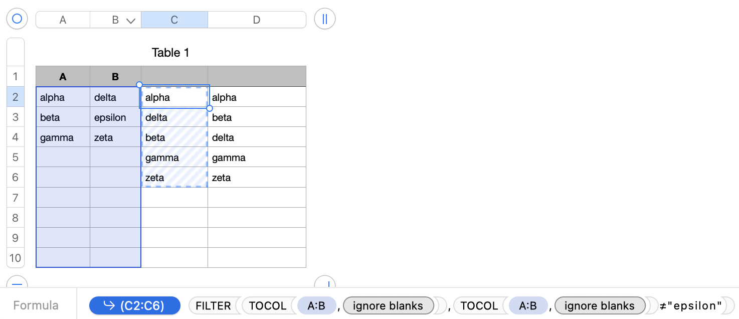 1 alpha delta =VSTACK(A1:A3,B1:B3) =FILTER(C1#,C1#<>"epsilon")