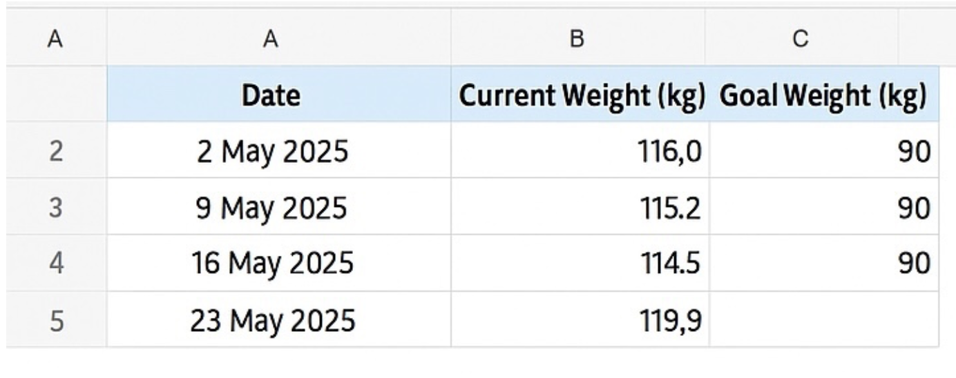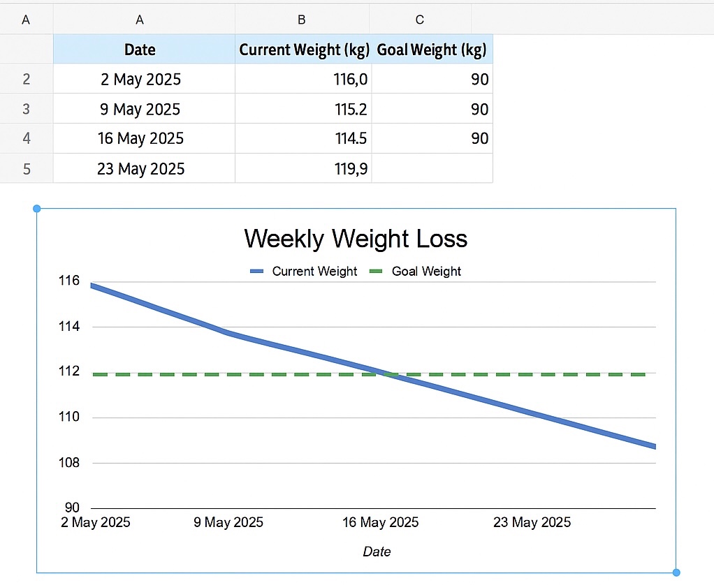 I have started a spreadsheet to show weigh in date, current weight weekly and the goal weight. I want a simple line graph showing progress to the goal but nothing I do works.