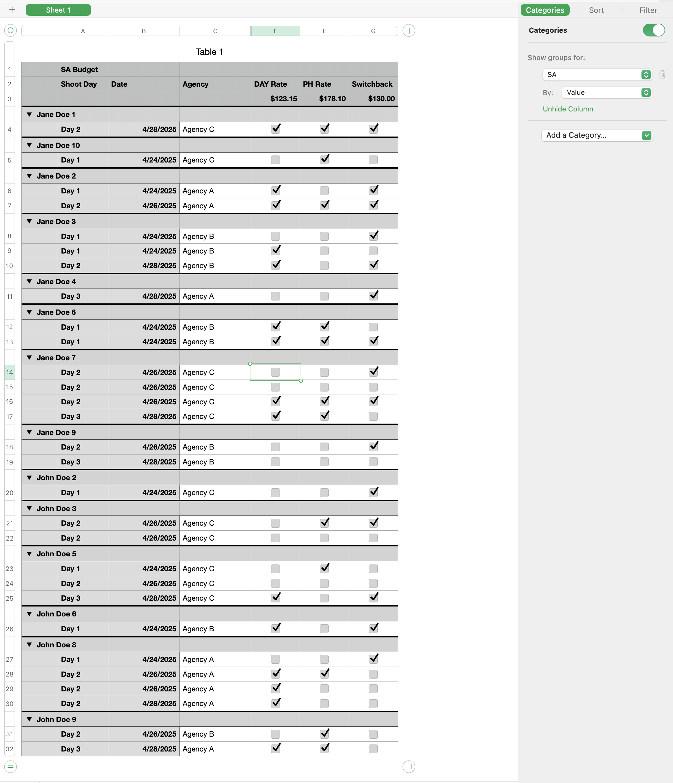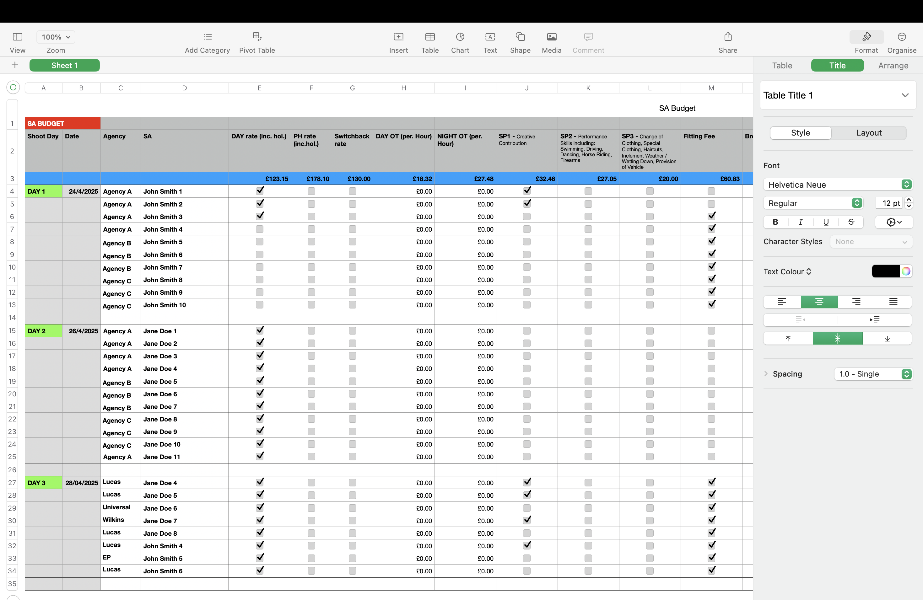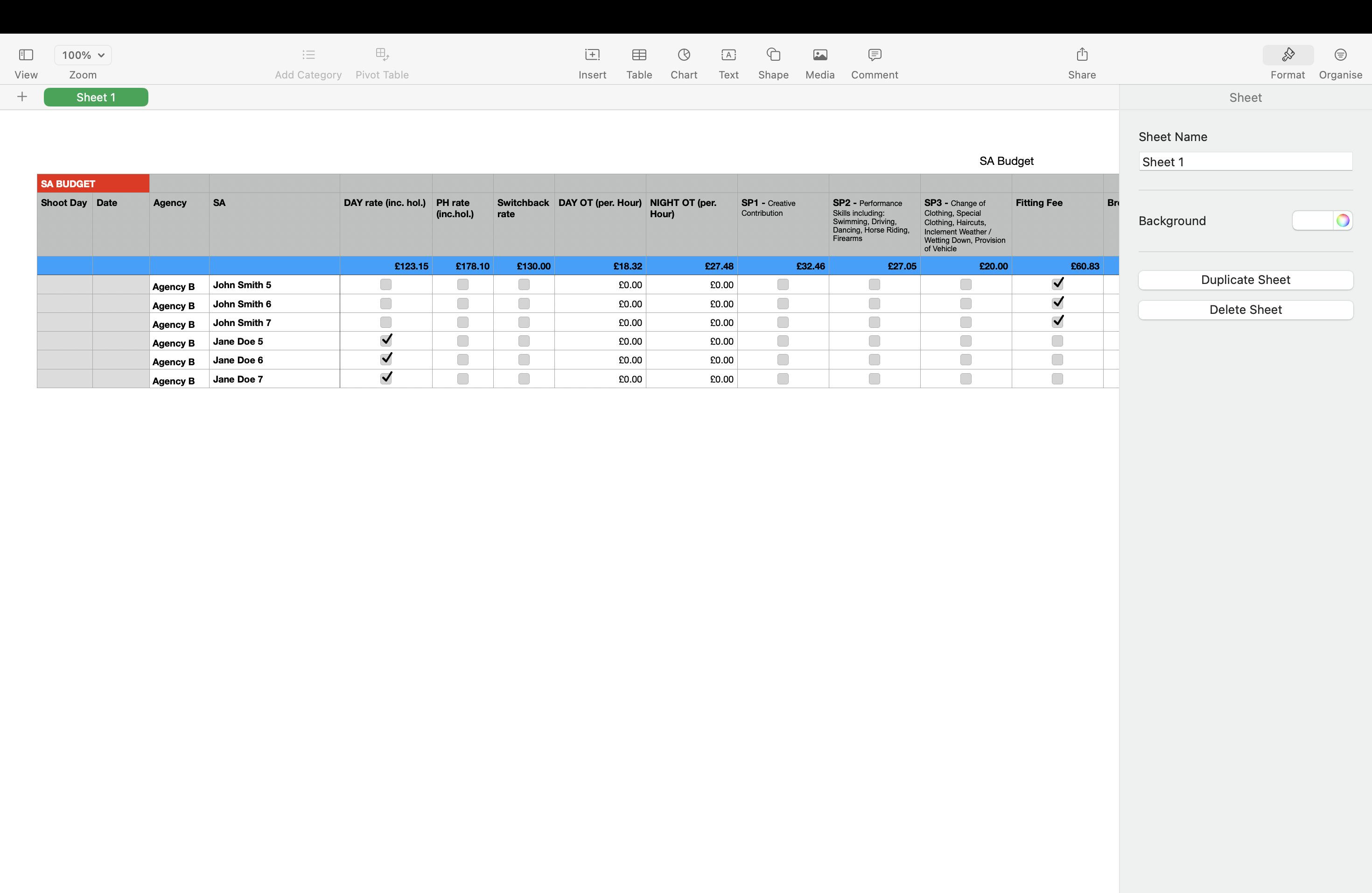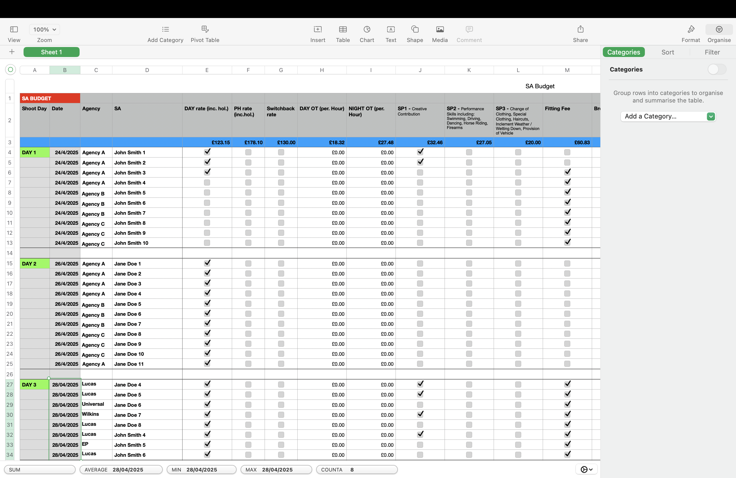 I'm hoping someone could help me in trying to organise this spreadsheet I'm working on. I'm putting together a budget spreadsheet looking after supporting artists for a film I'm working on. I love Numbers because of its ease of use and especially because of the extremely powerful quick filter function which I would like to try and find a way to use on this spreadsheet.