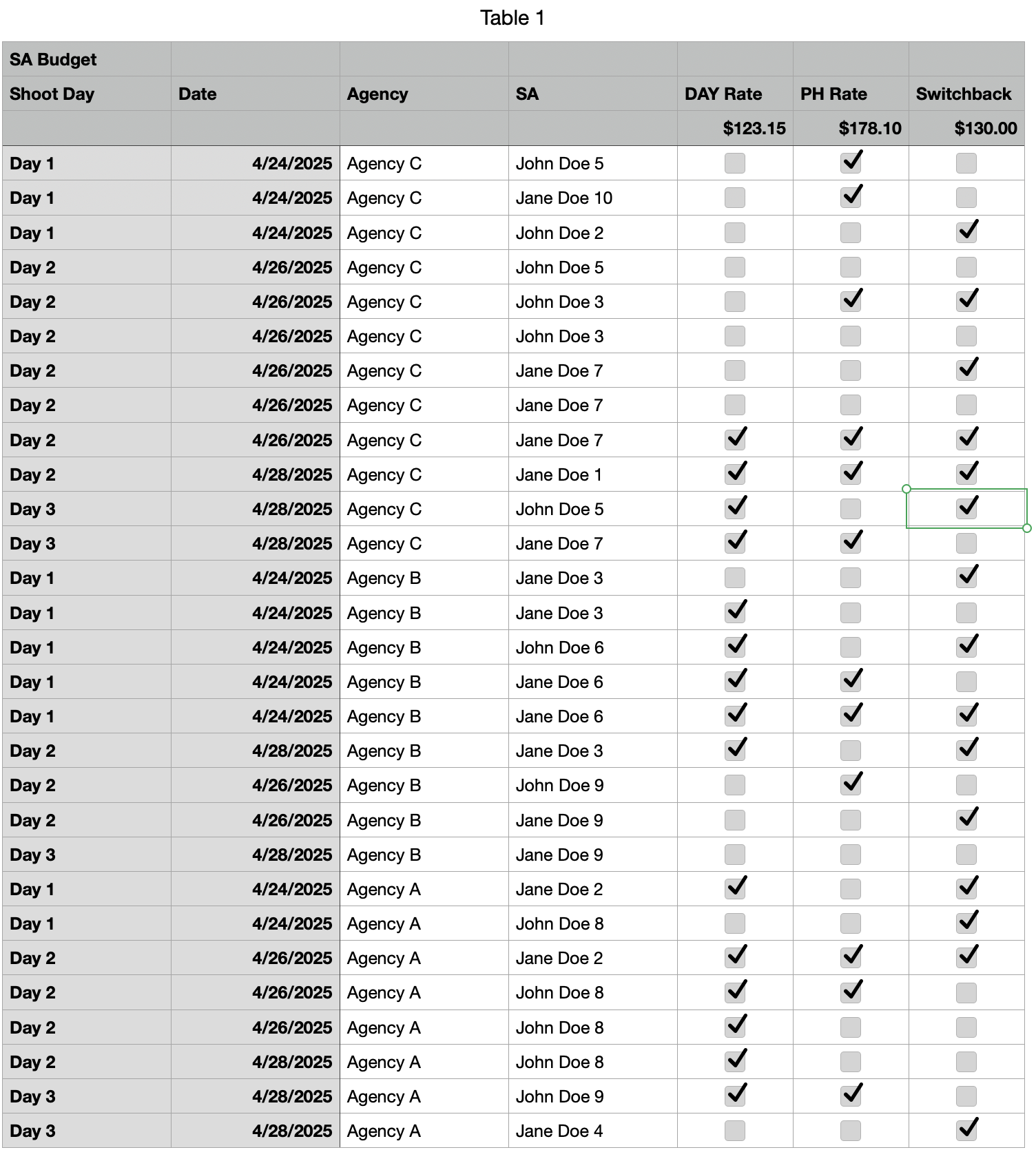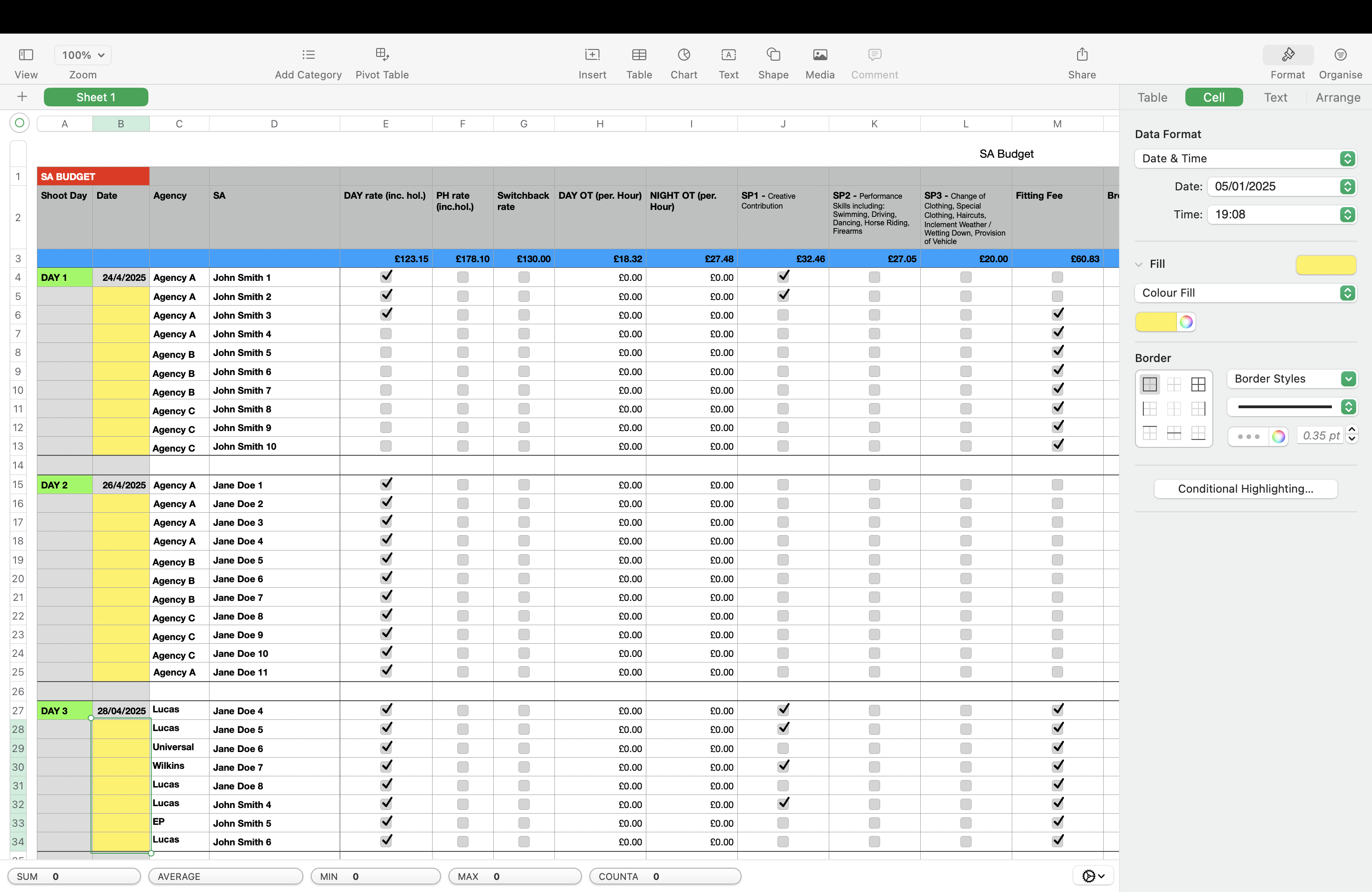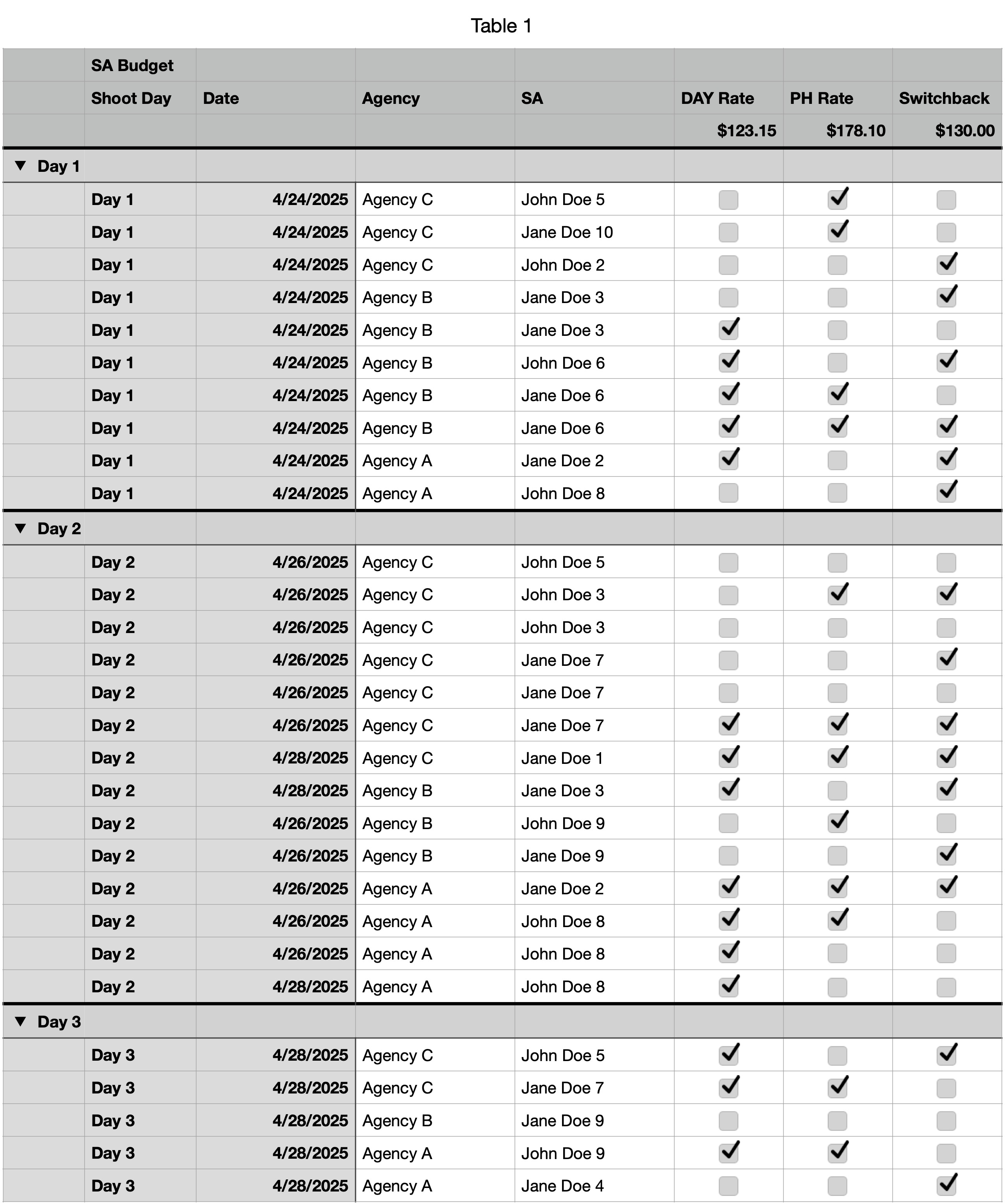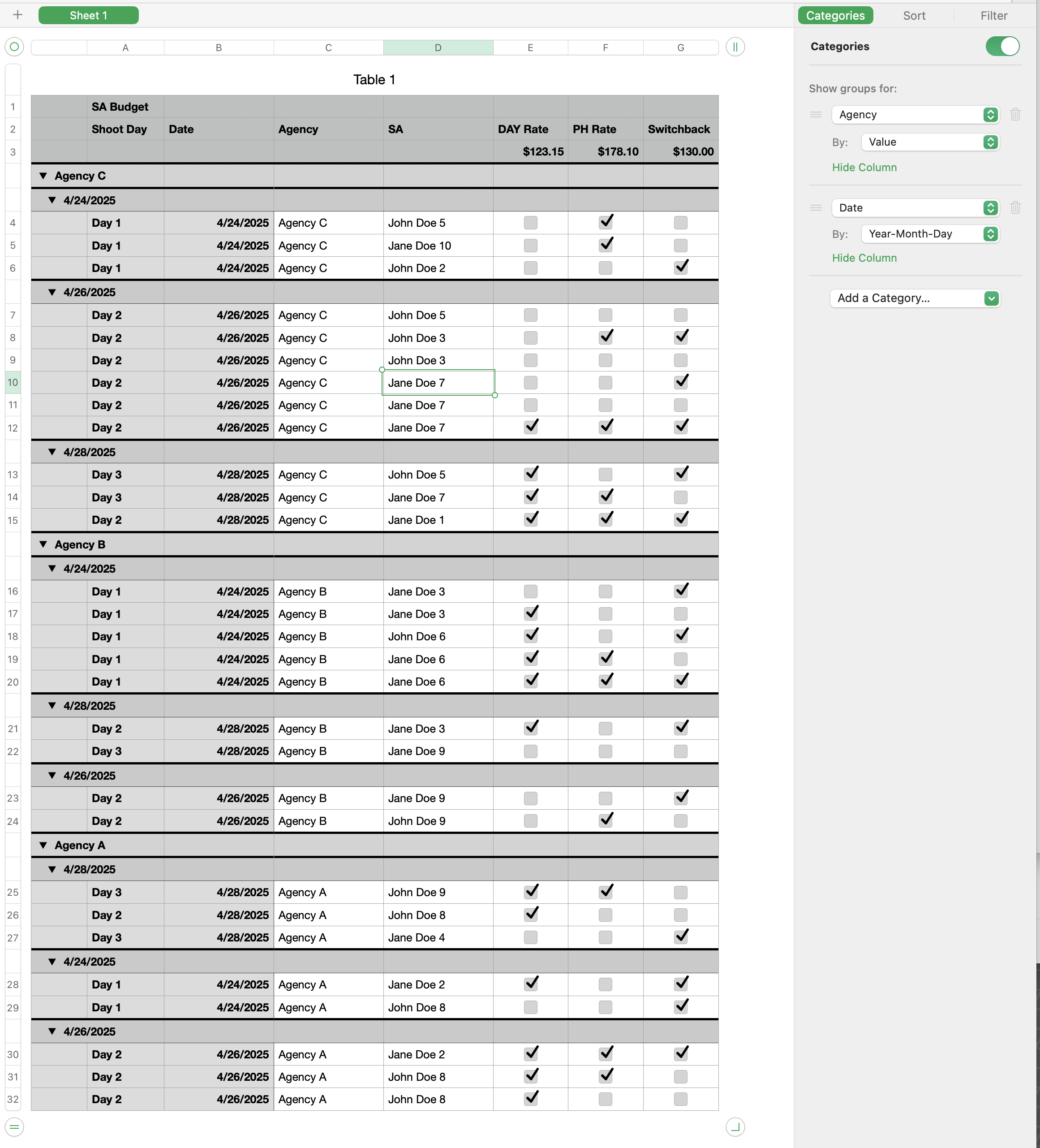 I'm hoping someone could help me in trying to organise this spreadsheet I'm working on. I'm putting together a budget spreadsheet looking after supporting artists for a film I'm working on. I love Numbers because of its ease of use and especially because of the extremely powerful quick filter function which I would like to try and find a way to use on this spreadsheet.