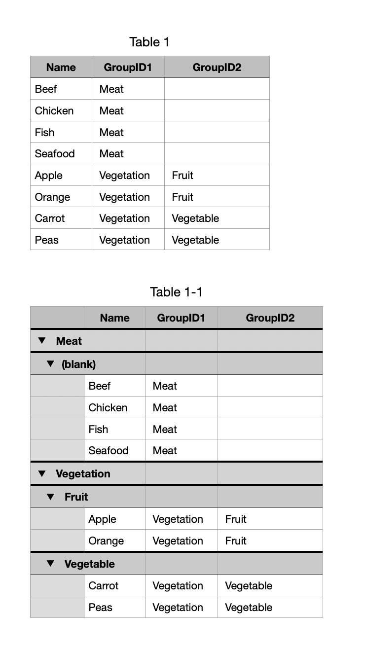 * The way to render the data in question to be uniform is to create a GroupID2 data value for the rows where "Meat" is the GroupID1 data value.