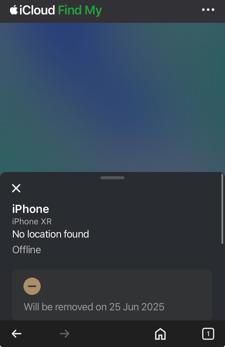 * Live Find My Location: When I log into the "Find My" application on another Apple device using my KAM****15@gmail.com Apple ID, this specific iPhone XR is accurately visible and listed under my devices, and its current live geographical location is displayed.