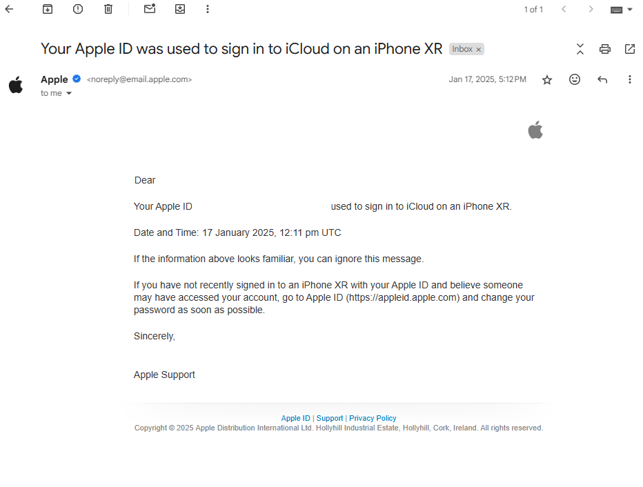 * Official Apple Email Notification: I possess an official email from Apple, sent to my KAM****15@gmail.com address, with the subject "Your Apple ID was used to sign in to iCloud on an iPhone XR." This email, dated January 17, 2023, at 12:11 PM UTC, explicitly confirms: "Your Apple ID KAM****15@gmail.com was used to sign in on iCloud on an iPhone XR."