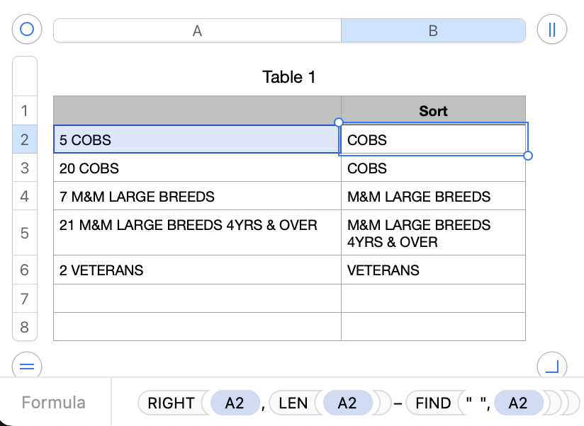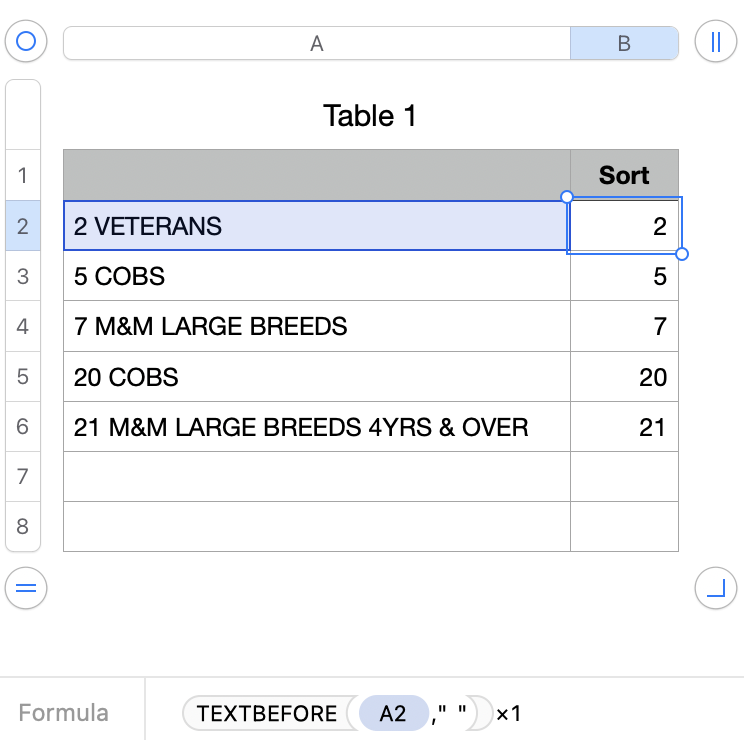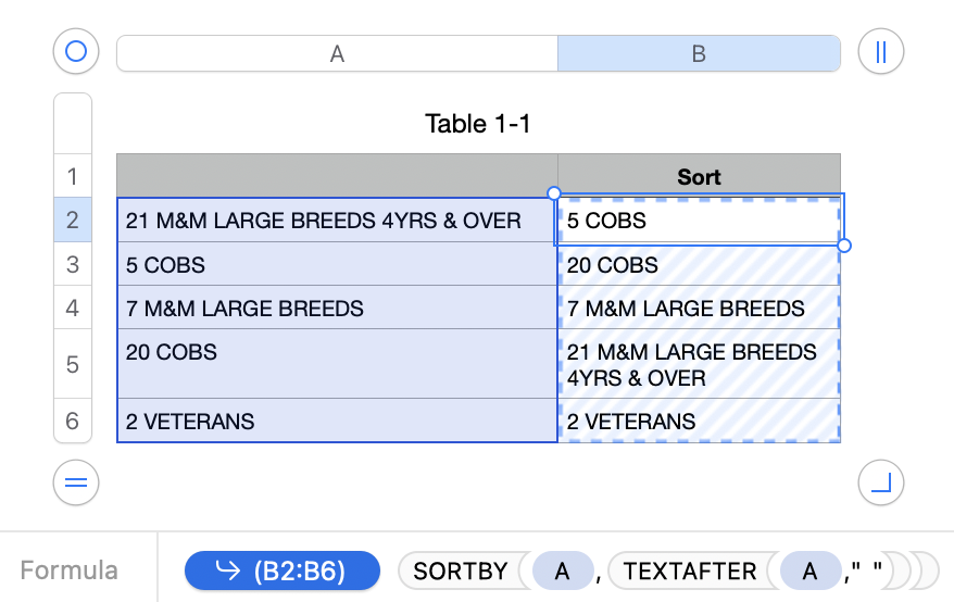 If the number matters and you want to ensuire rows like "5 COBS" and "20 COBS" sort numerically, you'll need a column C
