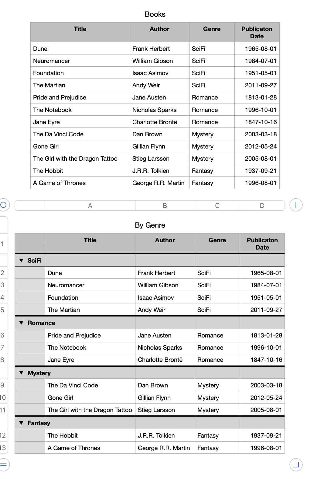 I have a few separate Numbers files to keep track of books I have read or want to read. I have separate files for eBooks (mostly Kindle books), audiobooks, & the few physical books I still have. All have Title & Author & a column to enter the date I completed the book. I have multiple files as some of the other columns pertain to just the eBooks or just the audiobooks, such as number of pages, whether they are in Kindle Unlimited or can be borrowed from the library, the narrators for audiobooks. Then I have multiple tables that are sorted by the different columns. I could just sort one table, but I like having separate ones. It's just a matter of personal preference.