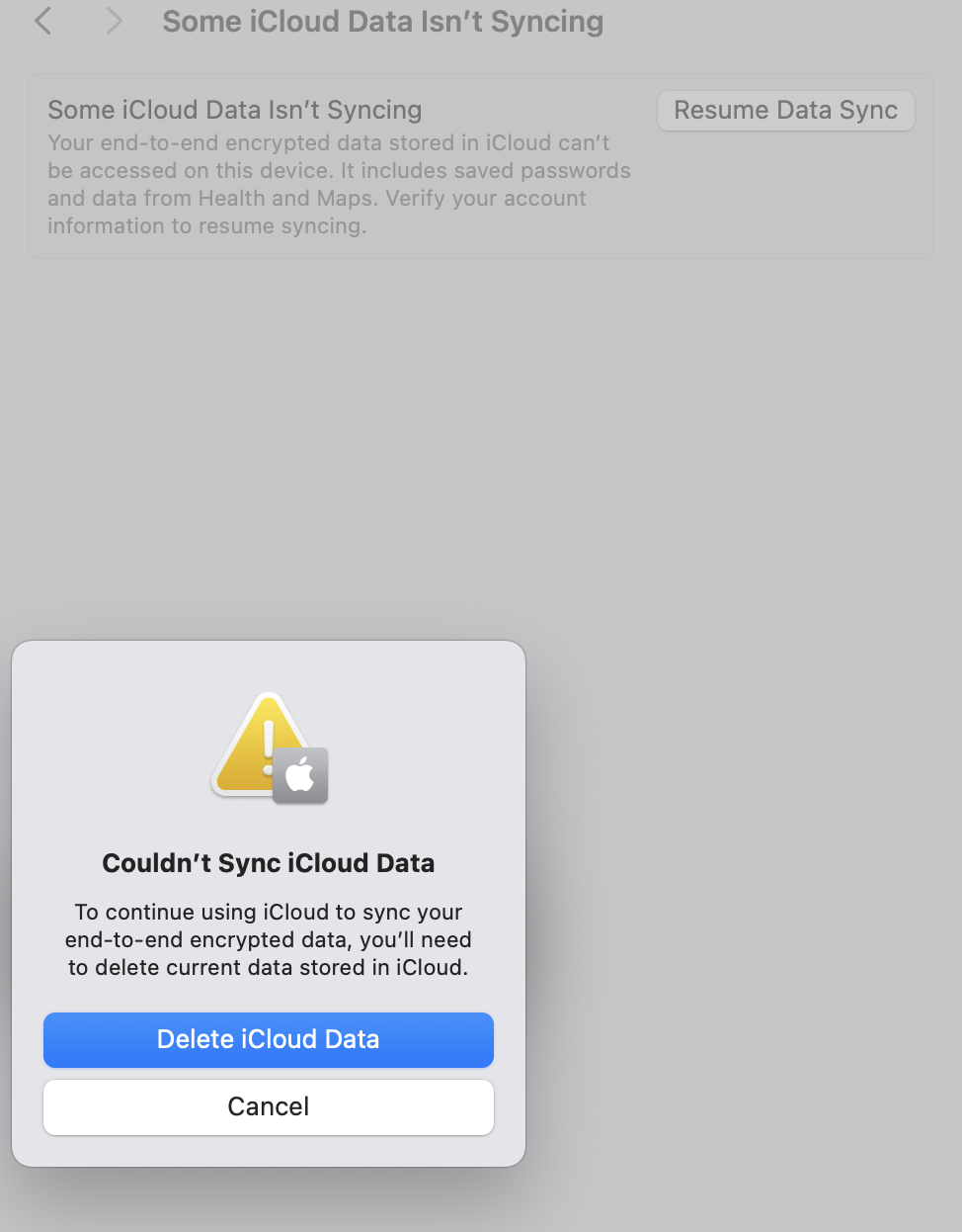 But upon following your steps, I have come across another issue of ICloud Data not syncing... and when I get to the last step, it is asking me to delete my ICloud data!! (Please see screenshots) I looked at the details and I don't mind deleting passwords, maps and health info, but this also includes my Apple card transactions that are for my business and I can't delete that.