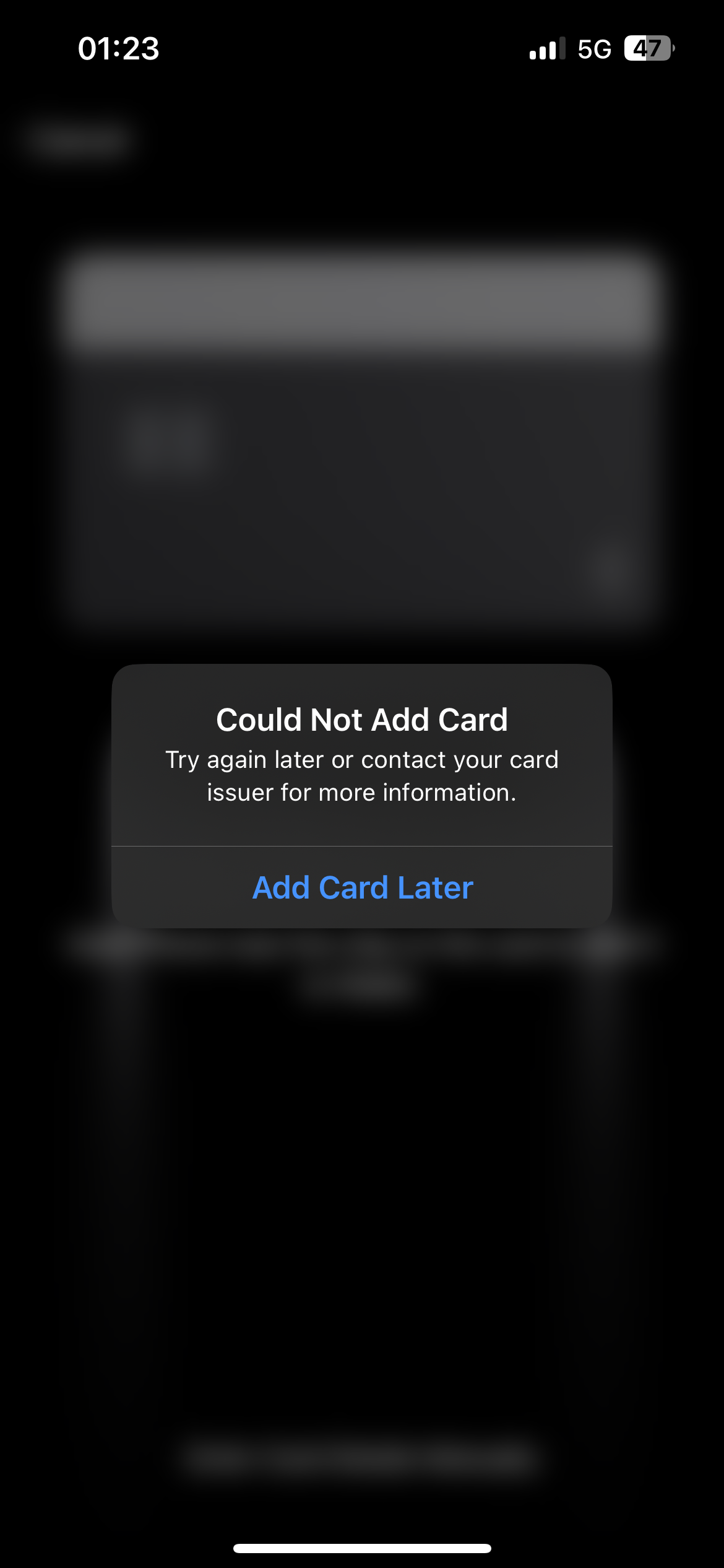 The card used to be added and working. I removed it from Wallet once; later the same day I tried to re-add it and it failed. It’s been over a month and I still cannot add the card.
