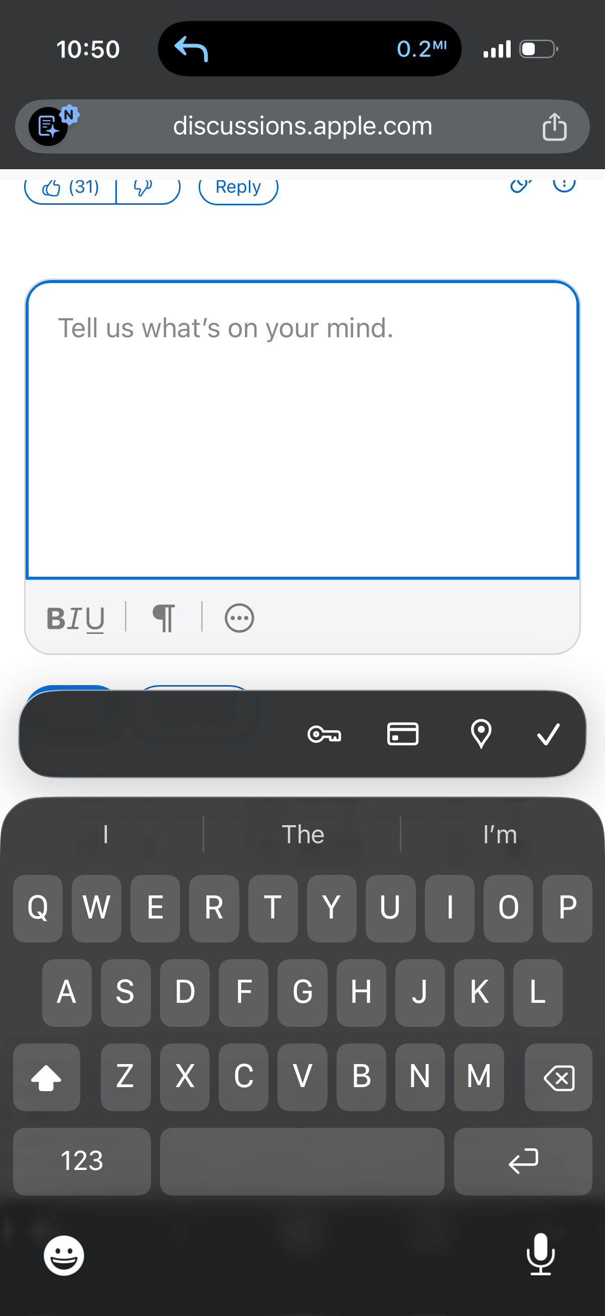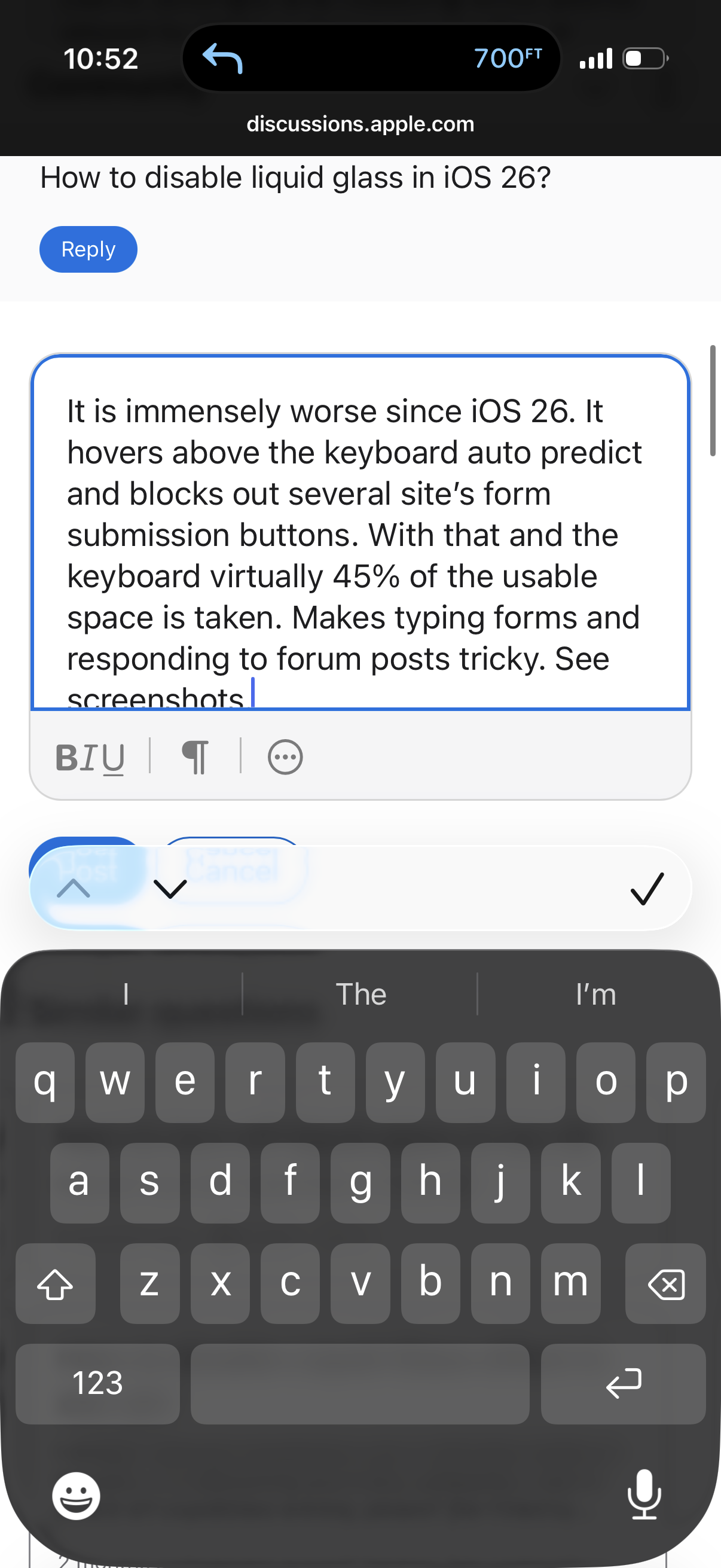 Herr it is in iOS 26. It hovers above the keyboard text predict area and blocks out several site’s form submission buttons. With that and the keyboard almost half of the usable screen space is taken. Makes typing forms and responding to forum posts tricky. See screenshots. Hopefully a fix is coming.