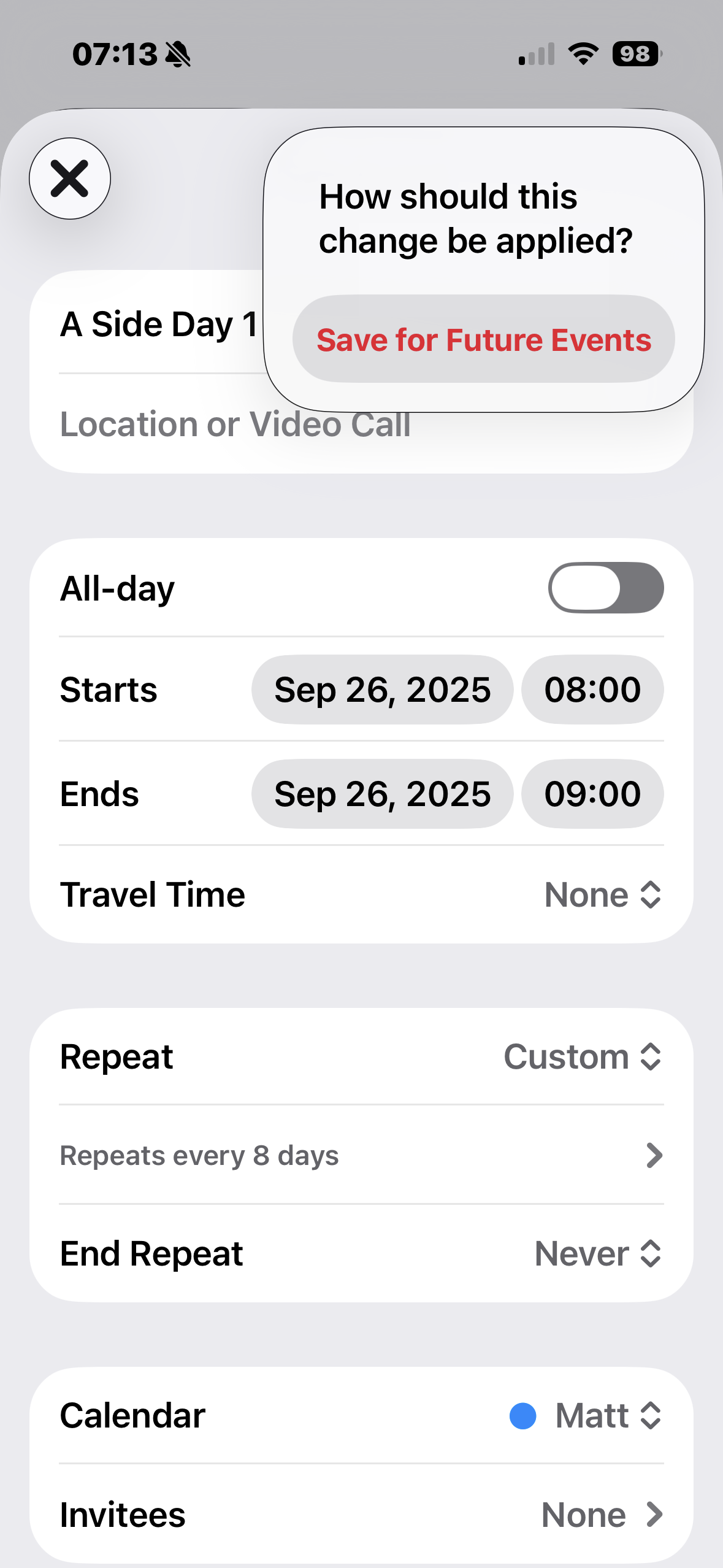 I have 4 recurring events in my calendar that at times I need to change for a single day… However when I go to change it now, it only gives me the option to save all future events.. It does not give me the option to change just the single day.. Any insight on how to fix this??